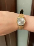 Женские наручные часы в круглом корпусе с позолотой, окошко даты в положении 3 часа, секундная стрелка центральная на светлом циферблате, ремешок кожаный черного цвета.