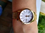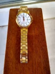 Женские наручные часы выполненные из стального сплава с позолотой, корпус круглой формы, окошко даты.