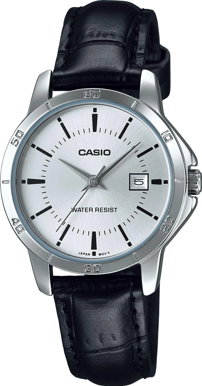 Женские наручные часы с центральной секундной стрелкой и окошком даты в положении 3 часа в стальном круглом корпусе на кожаном черном ремешке.