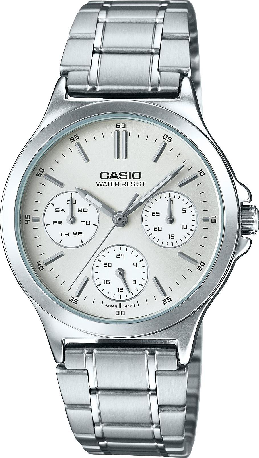 Женские наручные часы Casio Collection LTP-V300D-7A. Точный кварцевый механизм с аналоговой индикацией. В отличие от механических часов, не требуют завода и работают от батареи, показывая отклонение всего несколько секунд в месяц. На стрелки нанесен светонакопительный состав. Браслет из нержавеющей стали обладает высокой прочностью и износостойкостью, обеспечивая долговечность даже при активной эксплуатации. Материал устойчив к коррозии и сохраняет свой внешний вид надолго. Отображение времени возможно в 12-часовом или 24-часовом формате. Аккумулятор обеспечивает часы достаточным питанием приблизительно на 3 года. Корпус изготовлен из высококачественной часовой латуни с высокими антикоррозийными свойствами. Прочное, устойчивое к царапинам минеральное стекло защищает часы от повреждений. Часы являются водонепроницаемыми до 3 Бар. Цвет корпуса: Серебристый. Цвет циферблата: Серебристый. Высота (с ушками): 38 мм. Толщина: 8.2 мм. Гарантия: 2 года. Другие наименования модели: LTP-V300D-7AUDF.