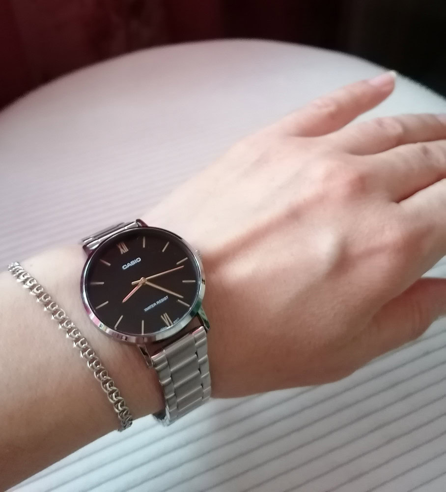Часы просто класс!!!Жене очень понравились,что на фото то и на яву.Браслет уменьшил сам очень быстро.На руке смотрятся очень солидно,Все супер!!!