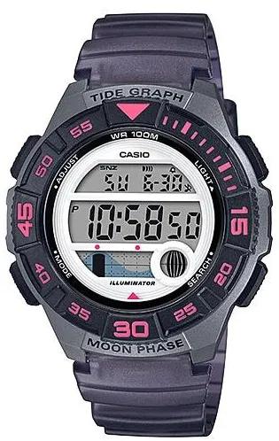 <b>Женские электронные мультифункциональные часы из серии Digital Collection. Круглый корпус из комбинированного полимерного материала. Акриловое стекло. Жидкокристаллический дисплей. Водозащита 100м. Черный пластиковый ремешок с обычной пряжкой.</b><br><br>• Японский кварцевый механизм, модуль 3474. Механизм работает от батареек CR1620 в течение 5 лет. Точность хода не хуже от -/+30 сек. в месяц. • Отображение возраста и фазы луны на основе введенных координат. • Графически отображаются сведения о приливах и отливах на основе введенных координат (широты и долготы) и лунного промежутка приливов и отливов. • Одновременное отображение текущего времени в двух разных часовых поясах. • Секундомер с точностью показаний 1/100 сек и максимальным временем измерения - 24 часа. • Электрическая подсветка - для освещения циферблата используется светодиод. • Таймер обратного отсчета с функцией автоповтора производит обратный отсчет, начиная с заданного времени. При окончании отсчета (0 минут, 0 секунд) издается 10-секундный сигнал. После чего таймер автоматически возвращается к установленному времени и снова начинает обратный отсчет. Максимальное время установки 24 часа - шаг измерения 1/1 сек, минимальное время установки 1 минута. • Отображение времени возможно в 12-часовом или 24-часовом формате. • 3 ежедневных будильника. Функция ежечасного сигнала обеспечивает подачу часами звукового сигнала при наступлении каждого нового часа. • Функция повтора сигнала будильника (Snooze). • Включение/выключение звука кнопок. Это означает, что часы больше не будут издавать звуковой сигнал при переключении от одной функции на другую. Заранее установленные звуковые сигналы или таймеры обратного отчета остаются активными, если звук кнопок отключен. • Автоматический календарь после настройки всегда отображает точную дату. • Срок службы батареи 5 лет. • Корпус из полимерного материала с однонаправленно поворотным безелем. • Водозащита до 10 АТМ. • Стекло из полимерного материала (акрила). • Ремешок из полимерного материала. • Простая ремешковая застежка.