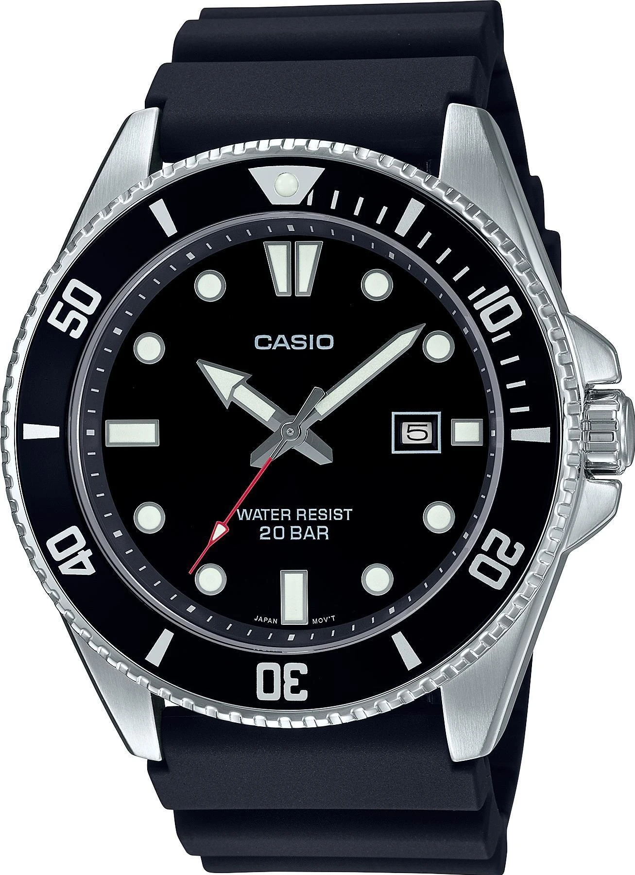 Мужские наручные часы Casio Collection MDV-107-1A1. Точный кварцевый механизм с аналоговой индикацией. Корпус изготовлен из высококачественной нержавеющей стали 316L с высокими антикоррозийными свойствами. На стрелки и отметки нанесен светонакопительный состав, благодаря этому считывать информацию с циферблата возможно и в темноте. На циферблате отображается текущее число месяца. Силиконовый ремешок. Прочное, устойчивое к царапинам минеральное стекло защищает часы от повреждений. Часы являются водонепроницаемыми до 20 Бар. Цвет корпуса: Черный. Цвет циферблата: Черный. Ширина (с заводной головкой): 48мм. Толщина: 12мм. Гарантия: 2 года. Другие наименования модели: MDV-107-1A1VEF.