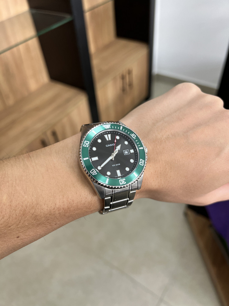 Мужские наручные часы Casio Collection MDV-107D-3A. Точный кварцевый механизм с аналоговой индикацией. Браслет из нержавеющей стали. Аккумулятор обеспечивает часы достаточным питанием приблизительно на 3 года. Браслет из нержавеющей стали. Прочное, устойчивое к царапинам минеральное стекло защищает часы от повреждений. На циферблате отображается текущее число месяца. Часы являются водонепроницаемыми до 20 Бар. Цвет циферблата: Зеленый. Цвет циферблата: Серебристый. Цвет корпуса: Черный. На стрелки и отметки нанесен светонакопительный состав, благодаря этому считывать информацию с циферблата возможно и в темноте. Толщина: 12 мм. Гарантия: 2 года.