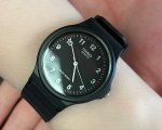 Кварцевые наручные часы в классическом исполнении, корпус пластиковый круглой формы, секундная стрелка центральная на черном циферблате.