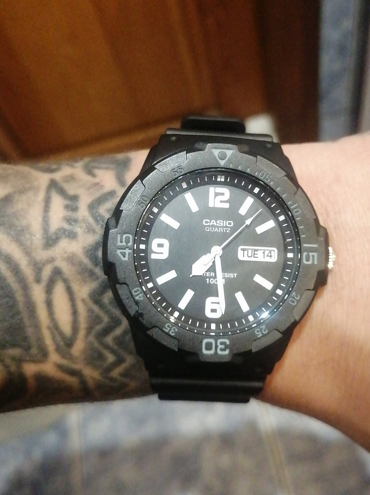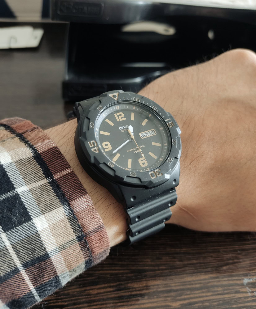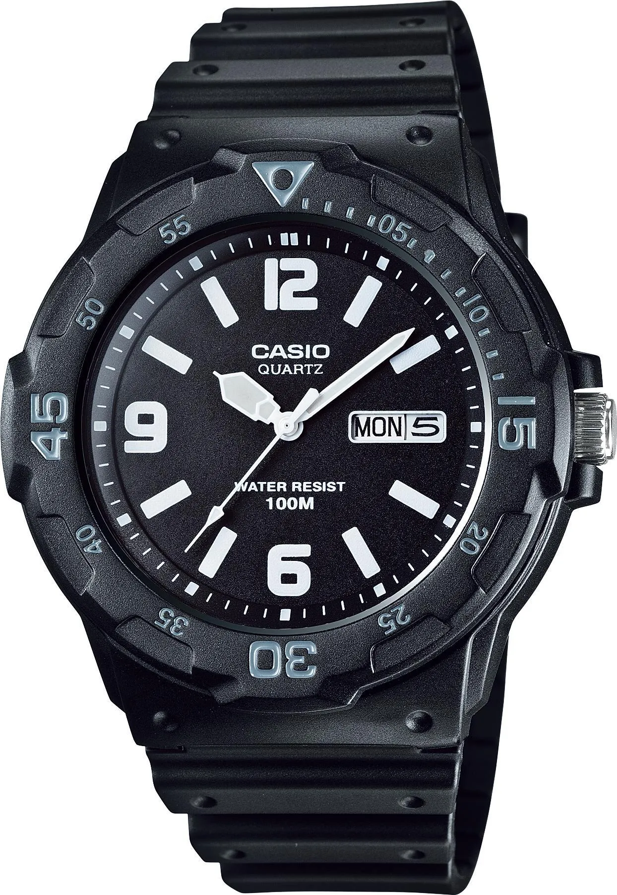 Наручные часы в спортивном стиле для мужчин. Доступная цена. Вращающийся безель. Корпус и стекло из прочного и долговечного полимерного материала. Водостойкость 100 метров. Кварцевый механизм с индикацией даты и дня недели.