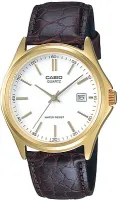 Мужские наручные часы с кварцевым механизмом и индикатором даты. В корпусе цвета золота на кожаном ремешке.