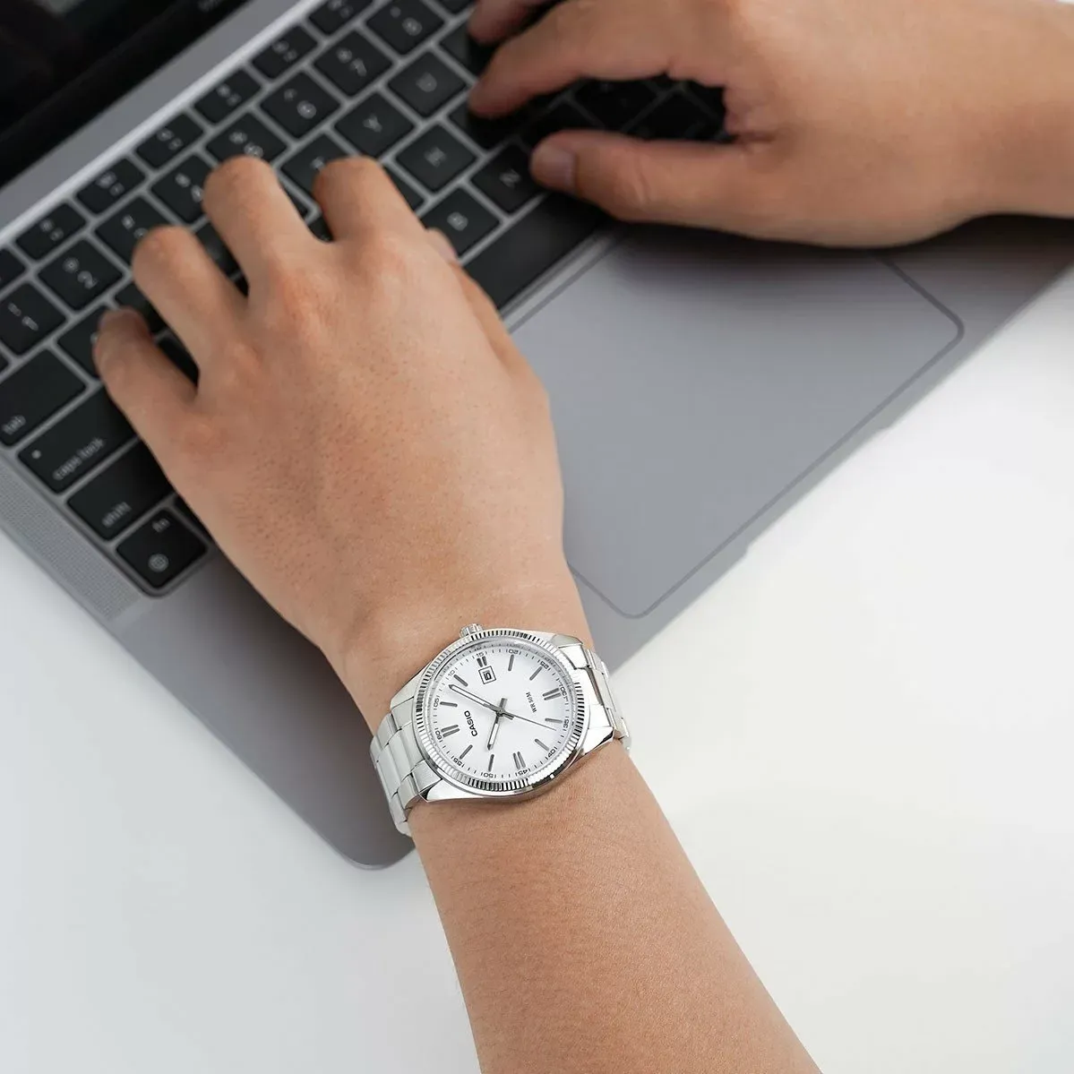 Мужские наручные часы с аналоговой индикацией в стальном корпусе. Механизм кварцевый с центральной секундной стрелкой и индикатором даты.