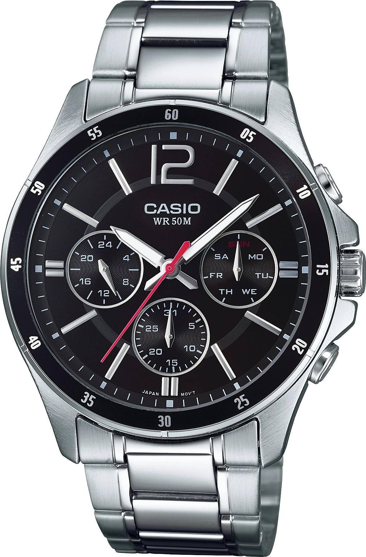 Многофункциональные мужские наручные часы круглой формы на каждый день. Модель с центральной секундной стрелкой, стрелочными указателями даты, дня недели и времени до полудня и после полудня. Корпус изготовлен из высококачественной часовой латуни. Точный кварцевый механизм. Центральная секундная стрелка. Точность хода не хуже -10 +15 сек./в месяц. Стрелочный указатель дня недели. Стрелочный указатель даты. Минеральное стекло устойчивое к возникновению царапин. Регулируемый по длине браслет из нержавеющей стали. Водозащита до 5 АТМ.