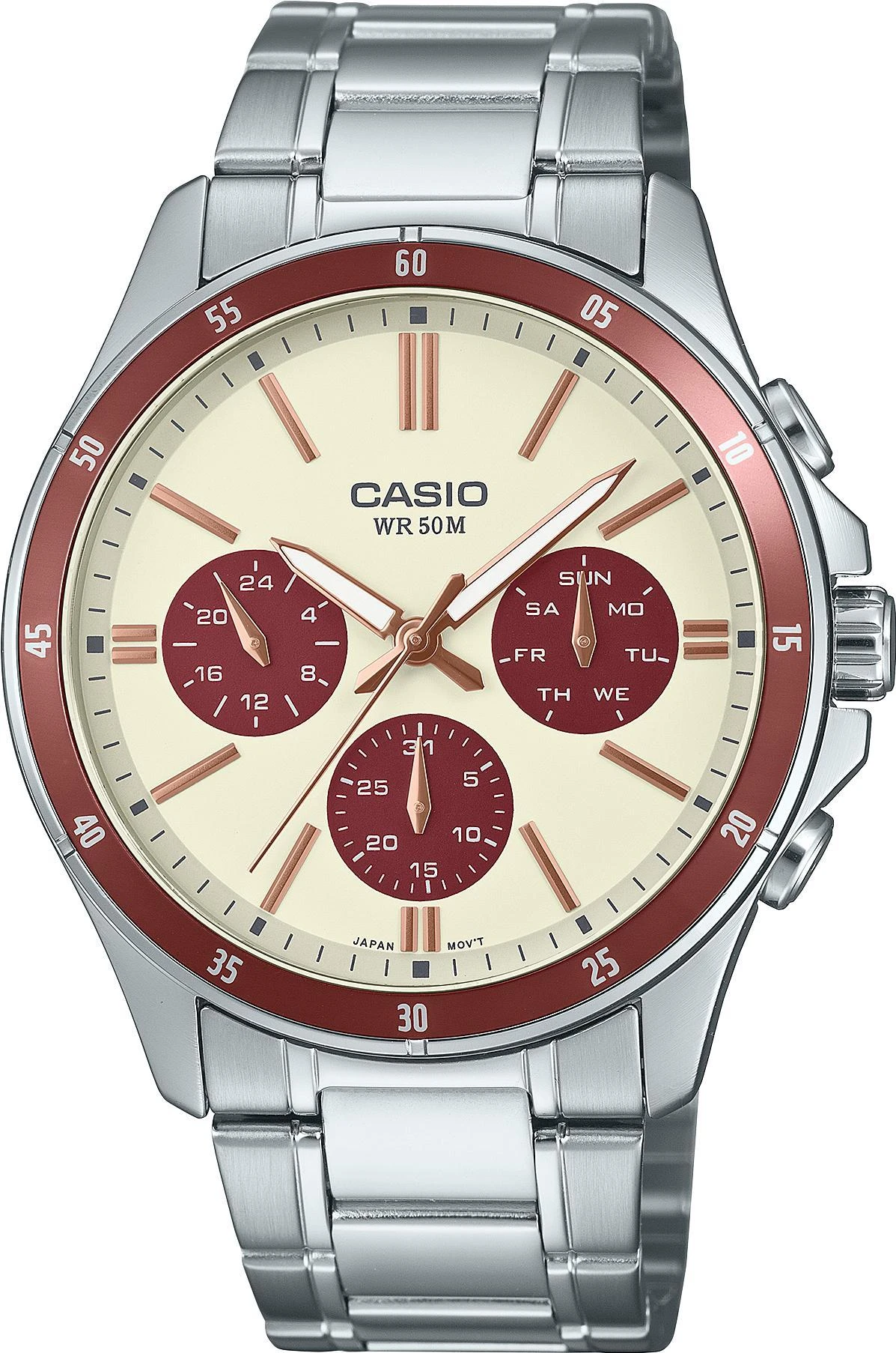 Мужские наручные часы Casio Collection MTP-1374D-5A2. Точный кварцевый механизм с аналоговой индикацией. Браслет из нержавеющей стали. Аккумулятор обеспечивает часы достаточным питанием приблизительно на 3 года. Браслет из нержавеющей стали. Прочное, устойчивое к царапинам минеральное стекло защищает часы от повреждений. Часы являются водонепроницаемыми до 5 Бар. Цвет циферблата: Серебристый. Цвет корпуса: Бежевый. Цвет корпуса: Красный. Высота (с ушками): 47 мм. Толщина: 11 мм. Гарантия: 2 года.