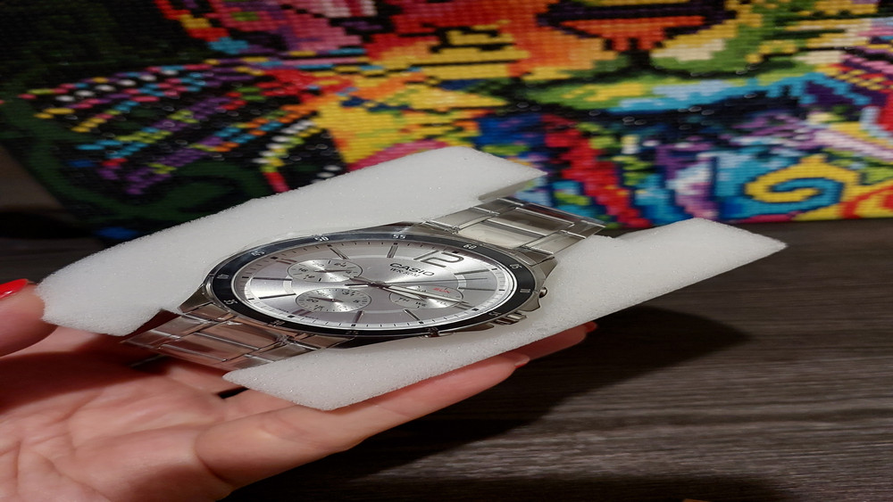 Заказывали в подарок коллеге. Красивые и солидные часы, не тяжёлые. Пришли в защитной плёнке на циферблат и ремешке.