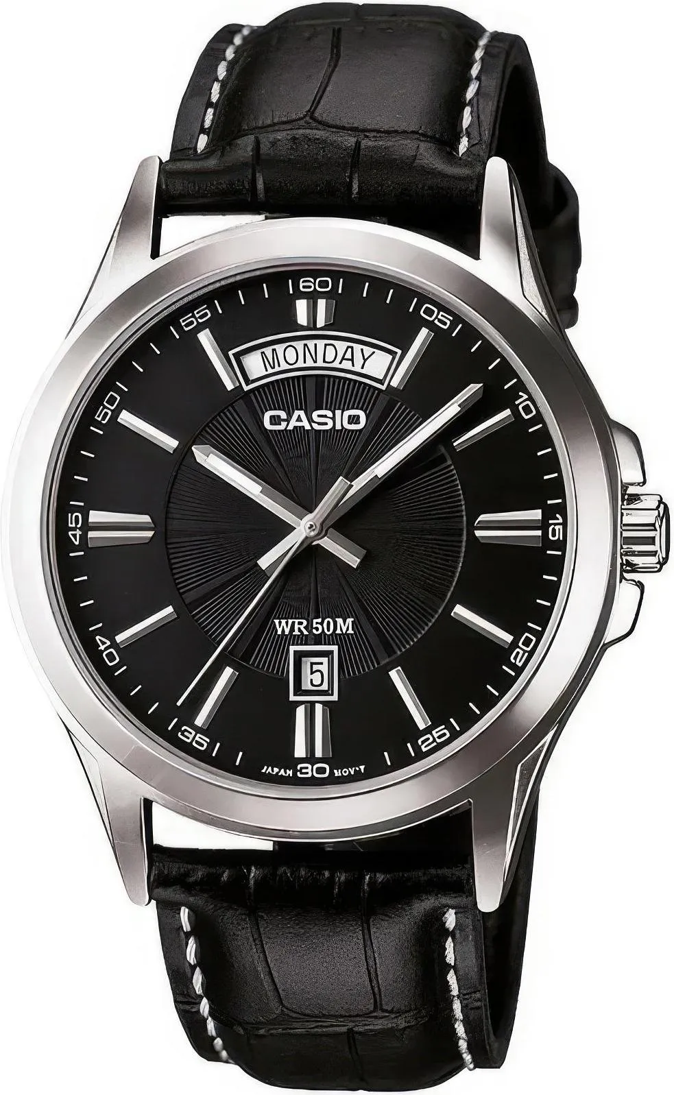 Наручные часы с современным универсальным дизайном для мужчин. Доступная цена. Корпус из металлического сплава с покрытием. Кожаный ремешок. Минеральное стекло. Точный кварцевый механизм, увеличенная индикация дня недели.