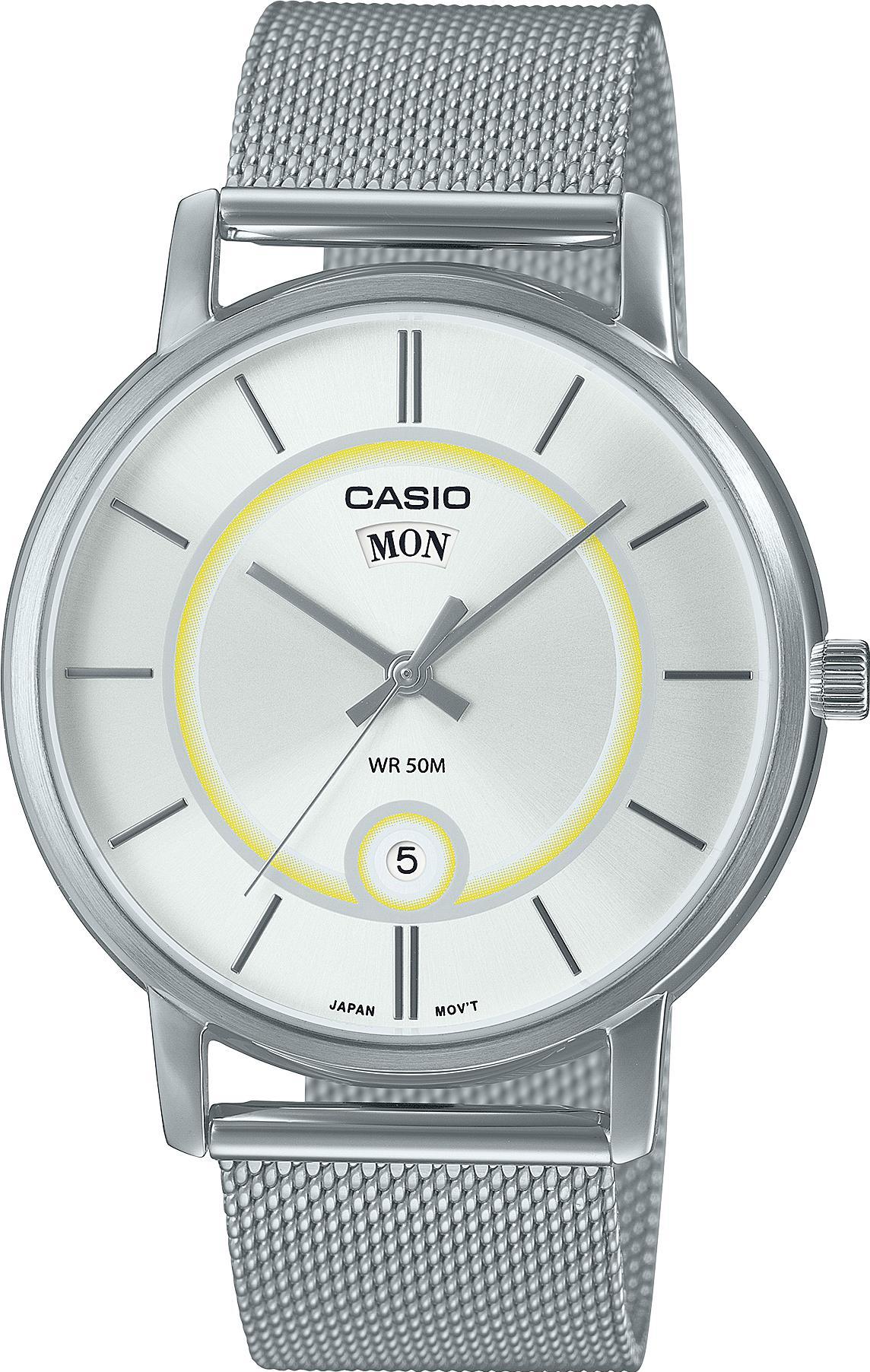 Мужские наручные часы Casio Collection MTP-B120M-7A. Точный кварцевый механизм с аналоговой индикацией. Браслет из нержавеющей стали. Аккумулятор обеспечивает часы достаточным питанием приблизительно на 3 года. Браслет из нержавеющей стали. Прочное, устойчивое к царапинам минеральное стекло защищает часы от повреждений. На циферблате отображается текущее число месяца и день недели. Часы являются водонепроницаемыми до 5 Бар. Цвет циферблата: Серебристый. Цвет корпуса: Серебристый. Толщина: 8 мм. Гарантия: 2 года.