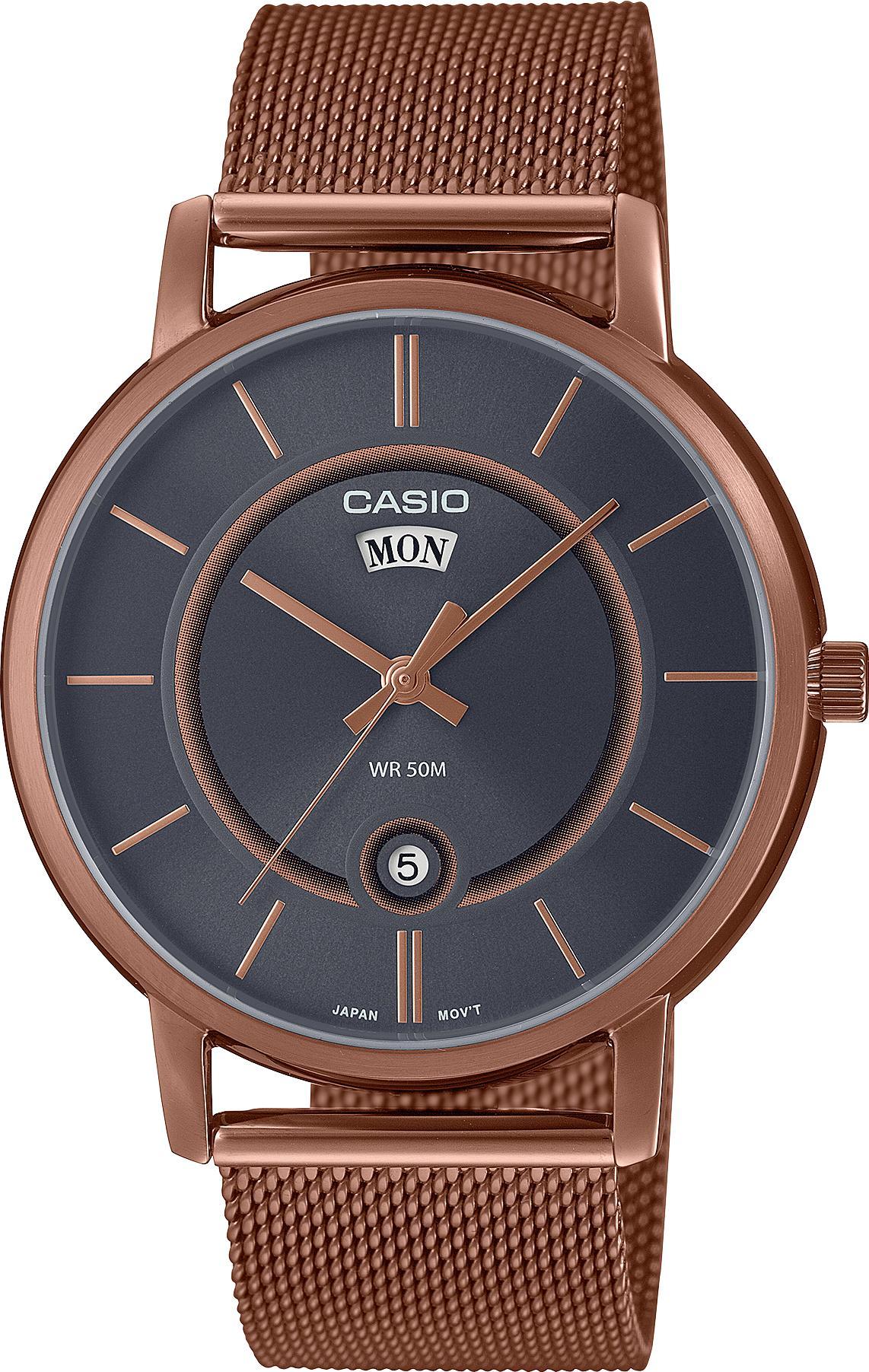 Мужские наручные часы Casio Collection MTP-B120MR-8A. Точный кварцевый механизм с аналоговой индикацией. Браслет из нержавеющей стали. Аккумулятор обеспечивает часы достаточным питанием приблизительно на 3 года. Браслет из нержавеющей стали. Прочное, устойчивое к царапинам минеральное стекло защищает часы от повреждений. На циферблате отображается текущее число месяца и день недели. Часы являются водонепроницаемыми до 5 Бар. Цвет циферблата: Розовое золото. Цвет корпуса: Черный. Толщина: 8 мм. Гарантия: 2 года.