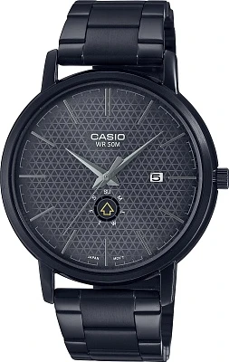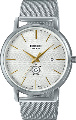 Мужские наручные часы Casio Collection MTP-B125M-7A. Точный кварцевый механизм с аналоговой индикацией. Корпус изготовлен из высококачественной нержавеющей стали 316L с высокими антикоррозийными свойствами. На стрелки и отметки нанесен светонакопительный состав, благодаря этому считывать информацию с циферблата возможно и в темноте. На циферблате отображается текущее число месяца и день недели. Браслет из нержавеющей стали. Прочное, устойчивое к царапинам минеральное стекло защищает часы от повреждений. Часы являются водонепроницаемыми до 5 Бар. Цвет корпуса: Серебристый. Цвет циферблата: Белый. Ширина (с заводной головкой): 48мм. Толщина: 8мм. Гарантия: 2 года. Другие наименования модели: MTP-B125M-7AVEF.