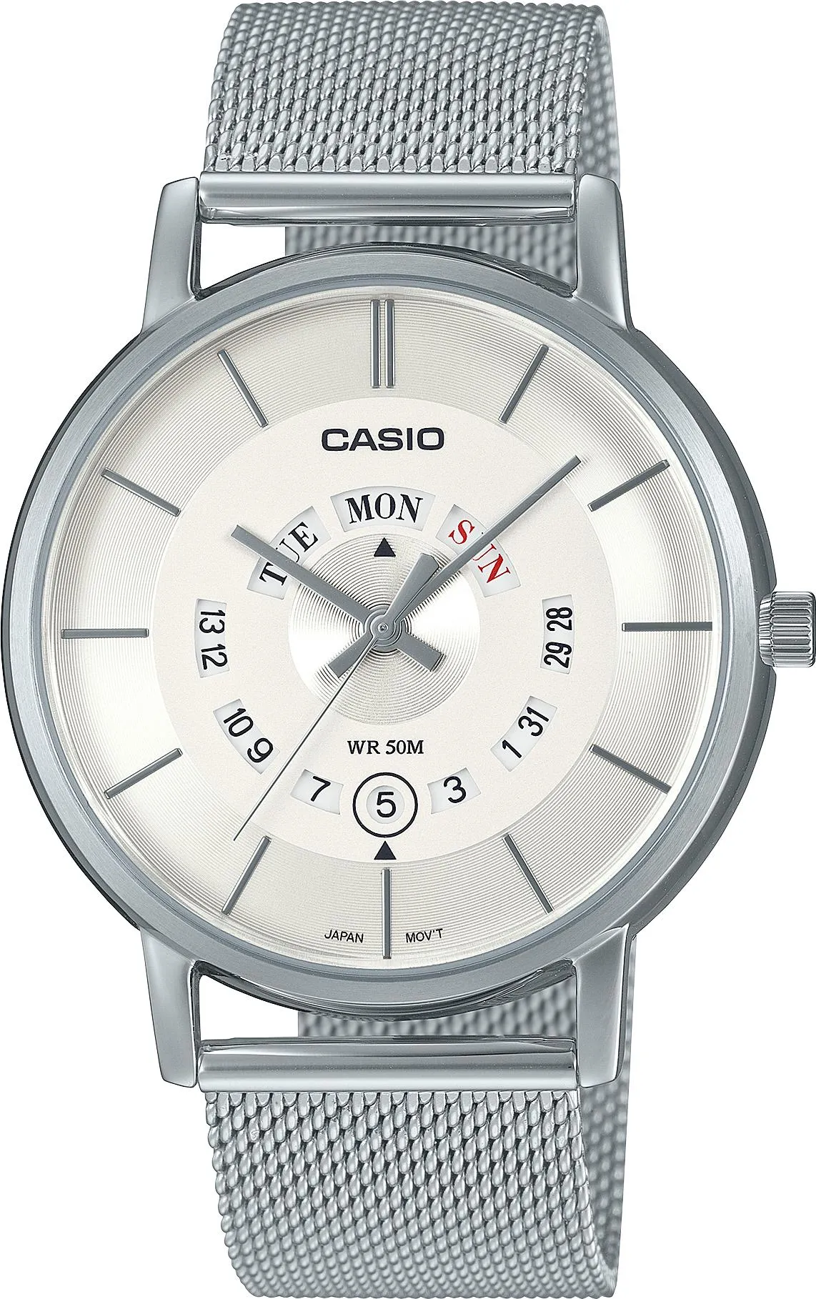 Мужские наручные часы Casio Collection MTP-B135M-7A. Точный кварцевый механизм с аналоговой индикацией. Браслет из нержавеющей стали. Аккумулятор обеспечивает часы достаточным питанием приблизительно на 3 года. Браслет из нержавеющей стали. Прочное, устойчивое к царапинам минеральное стекло защищает часы от повреждений. На циферблате отображается текущее число месяца и день недели. Часы являются водонепроницаемыми до 5 Бар. Цвет циферблата: Серебристый. Цвет корпуса: Белый. Толщина: 8 мм. Гарантия: 2 года.