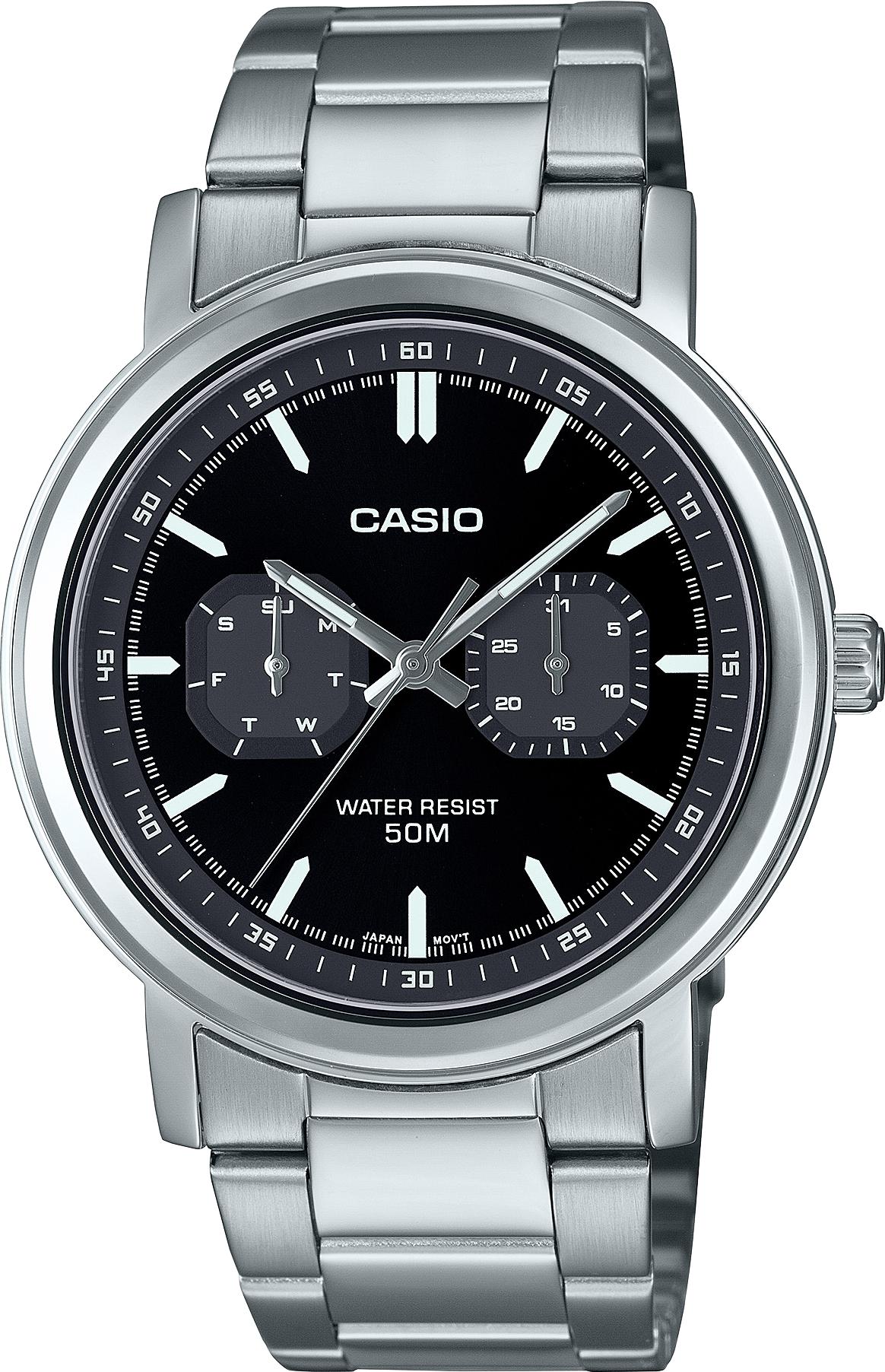 Мужские наручные часы Casio Collection MTP-E335D-1E. Точный кварцевый механизм с аналоговой индикацией. Браслет из нержавеющей стали. Браслет из нержавеющей стали. Прочное, устойчивое к царапинам минеральное стекло защищает часы от повреждений. На циферблате отображается текущее число месяца и день недели. Часы являются водонепроницаемыми до 5 Бар. Цвет циферблата: Серебристый. Цвет корпуса: Черный. На стрелки и отметки нанесен светонакопительный состав, благодаря этому считывать информацию с циферблата возможно и в темноте. Высота (с ушками): 48 мм. Толщина: 9 мм. Гарантия: 2 года.