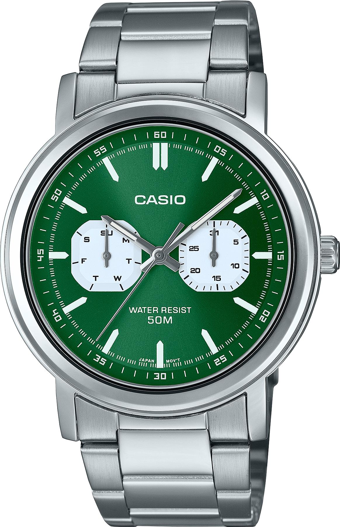 Мужские наручные часы Casio Collection MTP-E335D-3E. Точный кварцевый механизм с аналоговой индикацией. Браслет из нержавеющей стали. Аккумулятор обеспечивает часы достаточным питанием приблизительно на 3 года. Браслет из нержавеющей стали. Прочное, устойчивое к царапинам минеральное стекло защищает часы от повреждений. На циферблате отображается текущее число месяца и день недели. Часы являются водонепроницаемыми до 5 Бар. Цвет циферблата: Серебристый. Цвет корпуса: Белый. Цвет корпуса: Зеленый. На стрелки и отметки нанесен светонакопительный состав, благодаря этому считывать информацию с циферблата возможно и в темноте. Высота (с ушками): 48 мм. Толщина: 9 мм. Гарантия: 2 года.