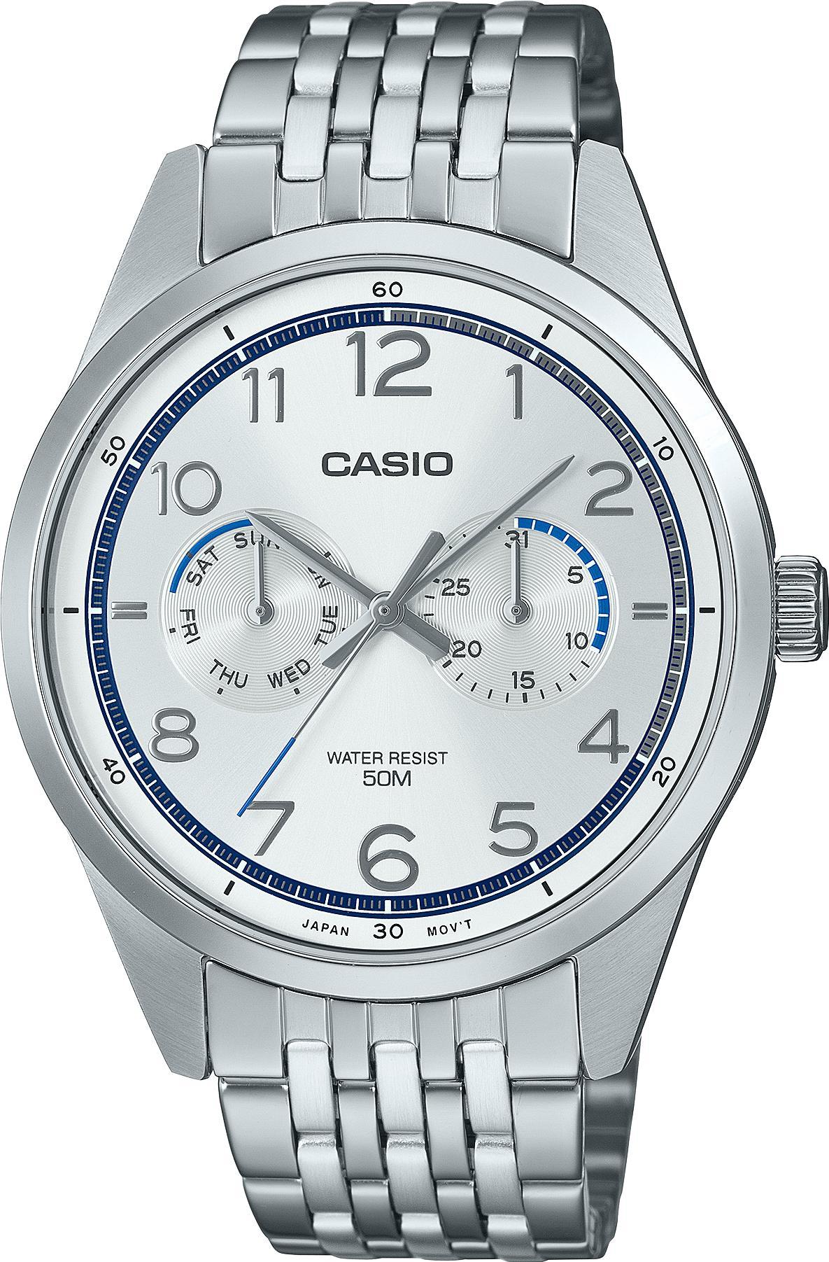 Мужские наручные часы Casio Collection MTP-E340D-7A. Точный кварцевый механизм с аналоговой индикацией. Браслет из нержавеющей стали. Браслет из нержавеющей стали. Прочное, устойчивое к царапинам минеральное стекло защищает часы от повреждений. На циферблате отображается текущее число месяца и день недели. Часы являются водонепроницаемыми до 5 Бар. Цвет циферблата: Серебристый. Цвет корпуса: Серебристый. Высота (с ушками): 51 мм. Толщина: 9 мм. Гарантия: 2 года.