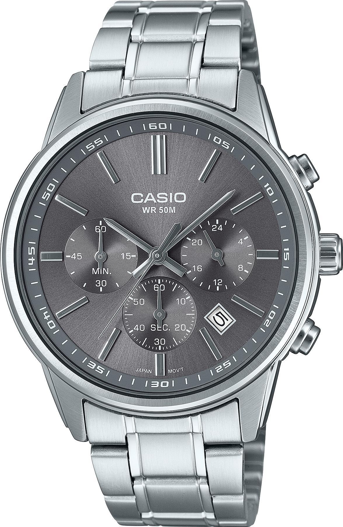 Мужские наручные часы Casio Collection MTP-E515D-8A. Точный кварцевый механизм с аналоговой индикацией. Браслет из нержавеющей стали. Функция хронографа. Отображение времени возможно в 12-часовом или 24-часовом формате. Браслет из нержавеющей стали. Прочное, устойчивое к царапинам минеральное стекло защищает часы от повреждений. На циферблате отображается текущее число месяца. Часы являются водонепроницаемыми до 5 Бар. Цвет циферблата: Серебристый. Цвет корпуса: Серый. Толщина: 11 мм. Гарантия: 2 года.