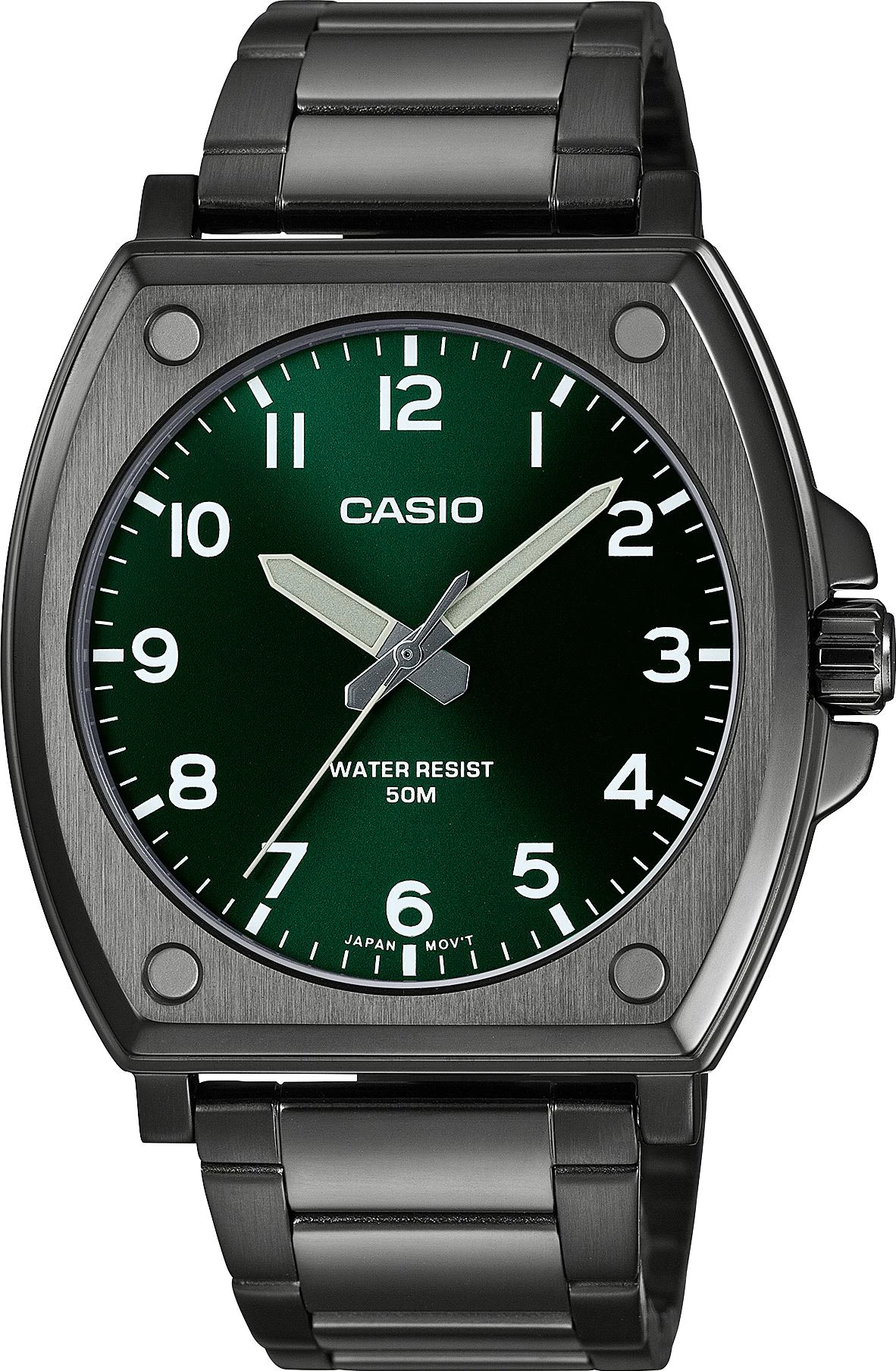 Мужские наручные часы Casio Collection MTP-E730B-3A. Точный кварцевый механизм с аналоговой индикацией. Браслет из нержавеющей стали. Браслет из нержавеющей стали. Прочное, устойчивое к царапинам минеральное стекло защищает часы от повреждений. Часы являются водонепроницаемыми до 5 Бар. Цвет циферблата: Черный. Цвет корпуса: Зеленый. На стрелки и отметки нанесен светонакопительный состав, благодаря этому считывать информацию с циферблата возможно и в темноте. Высота (с ушками): 48 мм. Толщина: 9 мм. Гарантия: 2 года.