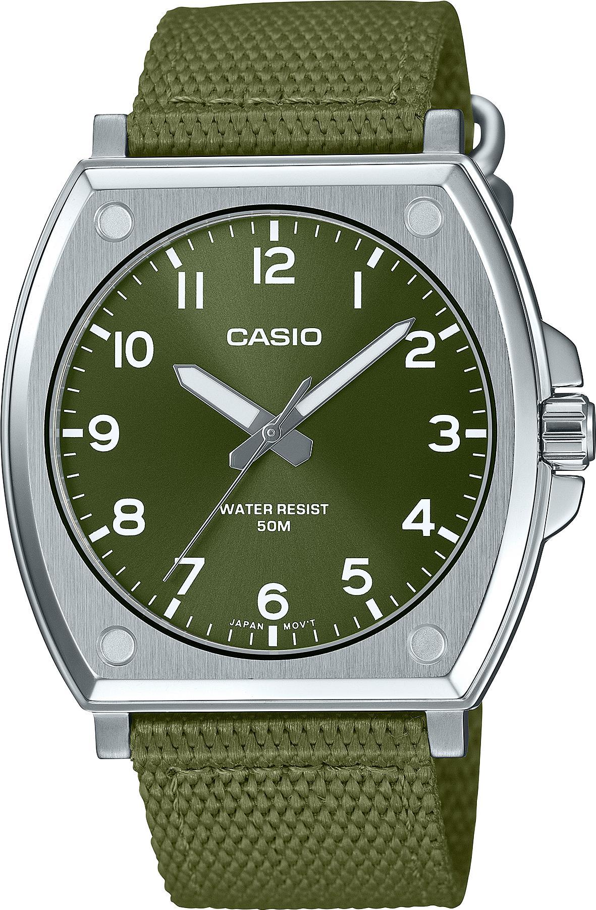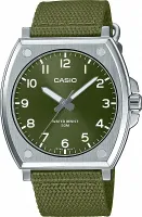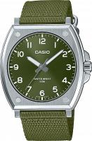 Мужские наручные часы Casio Collection MTP-E730C-3A. Точный кварцевый механизм с аналоговой индикацией. Текстильный ремешок. Браслет из нержавеющей стали. Прочное, устойчивое к царапинам минеральное стекло защищает часы от повреждений. Часы являются водонепроницаемыми до 5 Бар. Цвет циферблата: Серебристый. Цвет корпуса: Зеленый. На стрелки и отметки нанесен светонакопительный состав, благодаря этому считывать информацию с циферблата возможно и в темноте. Высота (с ушками): 48 мм. Толщина: 9 мм. Гарантия: 2 года.