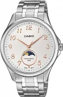 Эти классические мужские часы с круглым корпусом сочетают в себе элегантность и сложную функциональность. Лаконичный циферблат с арабскими цифрами украшен индикатором фаз Луны на позиции 6 часов, привнося нотку романтики и традиционного часового искусства. Модель отличается повышенной надежностью: заводная головка имеет защитные ушки, а задняя крышка снабжена винтовым фиксатором для лучшей герметичности. Удобный браслет оснащен тройной застежкой, которая расстегивается одним касанием. Часы работают от батареи до 3 лет.