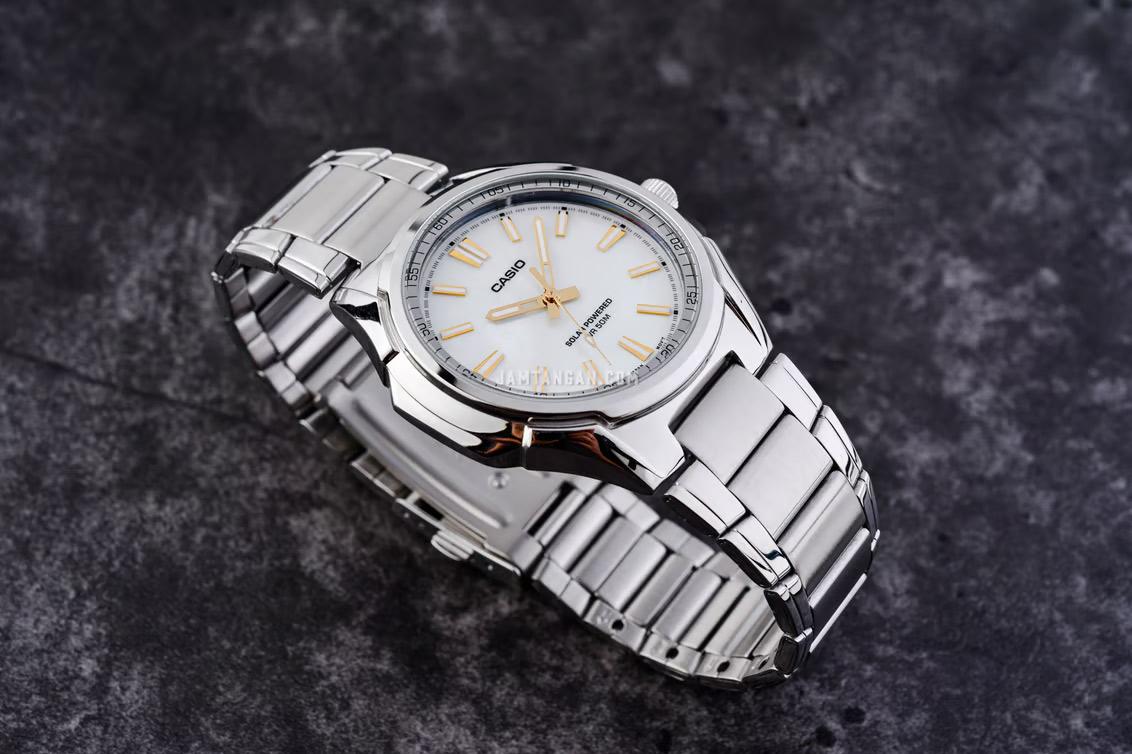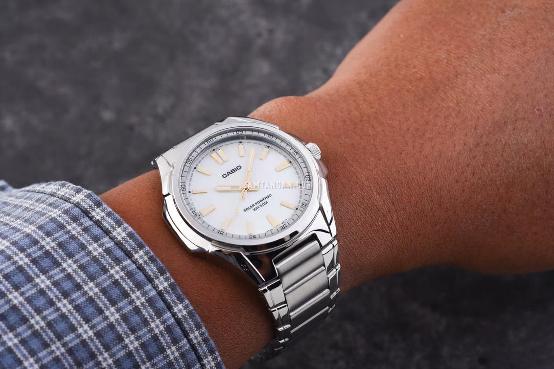 Мужские наручные часы Casio Collection MTP-RS100S-7A. Точный кварцевый механизм с аналоговой индикацией. Браслет из нержавеющей стали. Солнечная батарейка. Солнечная подзаряжающаяся батарейка обеспечивает питание часов для работы. Браслет из нержавеющей стали. Прочное, устойчивое к царапинам минеральное стекло защищает часы от повреждений. Часы являются водонепроницаемыми до 5 Бар. Цвет циферблата: Серебристый. Цвет корпуса: Перламутровый. На стрелки и отметки нанесен светонакопительный состав, благодаря этому считывать информацию с циферблата возможно и в темноте. Толщина: 10 мм. Гарантия: 2 года.