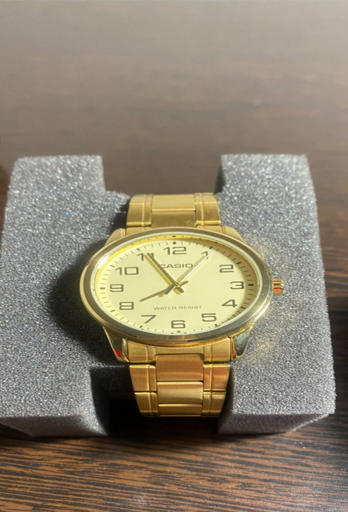 Мужские наручные часы Casio Collection MTP-V001G-9B. Точный кварцевый механизм с аналоговой индикацией. Корпус изготовлен из высококачественной нержавеющей стали 316L с высокими антикоррозийными свойствами. Браслет из нержавеющей стали. Прочное, устойчивое к царапинам минеральное стекло защищает часы от повреждений. Часы являются водонепроницаемыми до 3 Бар. Цвет корпуса: Желтое золото. Цвет циферблата: Золотистый. Ширина (с заводной головкой): 38мм. Толщина: 8мм. Гарантия: 2 года.