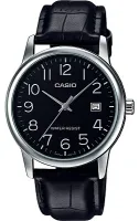 Мужские наручные часы в круглом корпусе с позолотой, окошко даты в положении 3 часа, секундная стрелка центральная на черном циферблате, ремешок кожаный коричневого цвета.