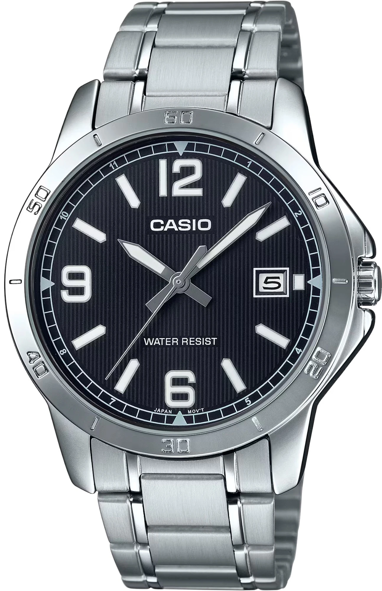 Мужские наручные часы Casio Collection MTP-V004D-1B2. Точный кварцевый механизм с аналоговой индикацией. В отличие от механических часов, не требуют завода и работают от батареи, показывая отклонение всего несколько секунд в месяц. На стрелки нанесен светонакопительный состав. Браслет из нержавеющей стали обладает высокой прочностью и износостойкостью, обеспечивая долговечность даже при активной эксплуатации. Материал устойчив к коррозии и сохраняет свой внешний вид надолго. Аккумулятор обеспечивает часы достаточным питанием приблизительно на 3 года. Корпус изготовлен из высококачественной часовой латуни с высокими антикоррозийными свойствами. Прочное, устойчивое к царапинам минеральное стекло защищает часы от повреждений. Часы являются водонепроницаемыми до 3 Бар. Цвет корпуса: Серебристый. Цвет циферблата: Черный. Высота (с ушками): 47 мм. Толщина: 8.3 мм. Гарантия: 2 года. Другие наименования модели: MTP-V004D-1B2DF, MTP-V004D-1B2UDF.