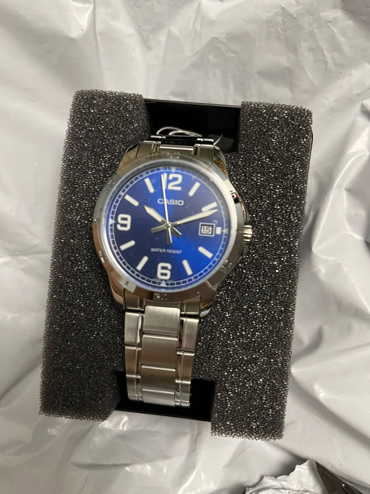 Мужские наручные часы Casio Collection MTP-V004D-2B. Точный кварцевый механизм с аналоговой индикацией. Корпус изготовлен из высококачественной нержавеющей стали 316L с высокими антикоррозийными свойствами. На стрелки и отметки нанесен светонакопительный состав, благодаря этому считывать информацию с циферблата возможно и в темноте. На циферблате отображается текущее число месяца. Браслет из нержавеющей стали. Прочное, устойчивое к царапинам минеральное стекло защищает часы от повреждений. Часы являются водонепроницаемыми до 3 Бар. Цвет корпуса: Серебристый. Цвет циферблата: Синий. Ширина (с заводной головкой): 42мм. Толщина: 10мм. Гарантия: 2 года.