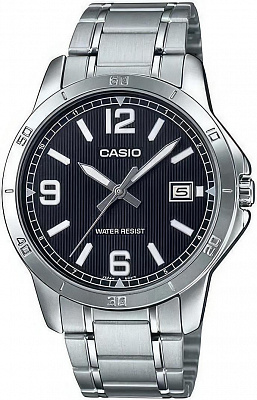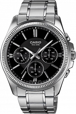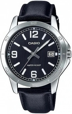 Мужские наручные часы с окошком даты и центральной секундной стрелкой в стальном круглом корпусе, вместо цифр риски на черном циферблате. На черном кожаном ремешке.