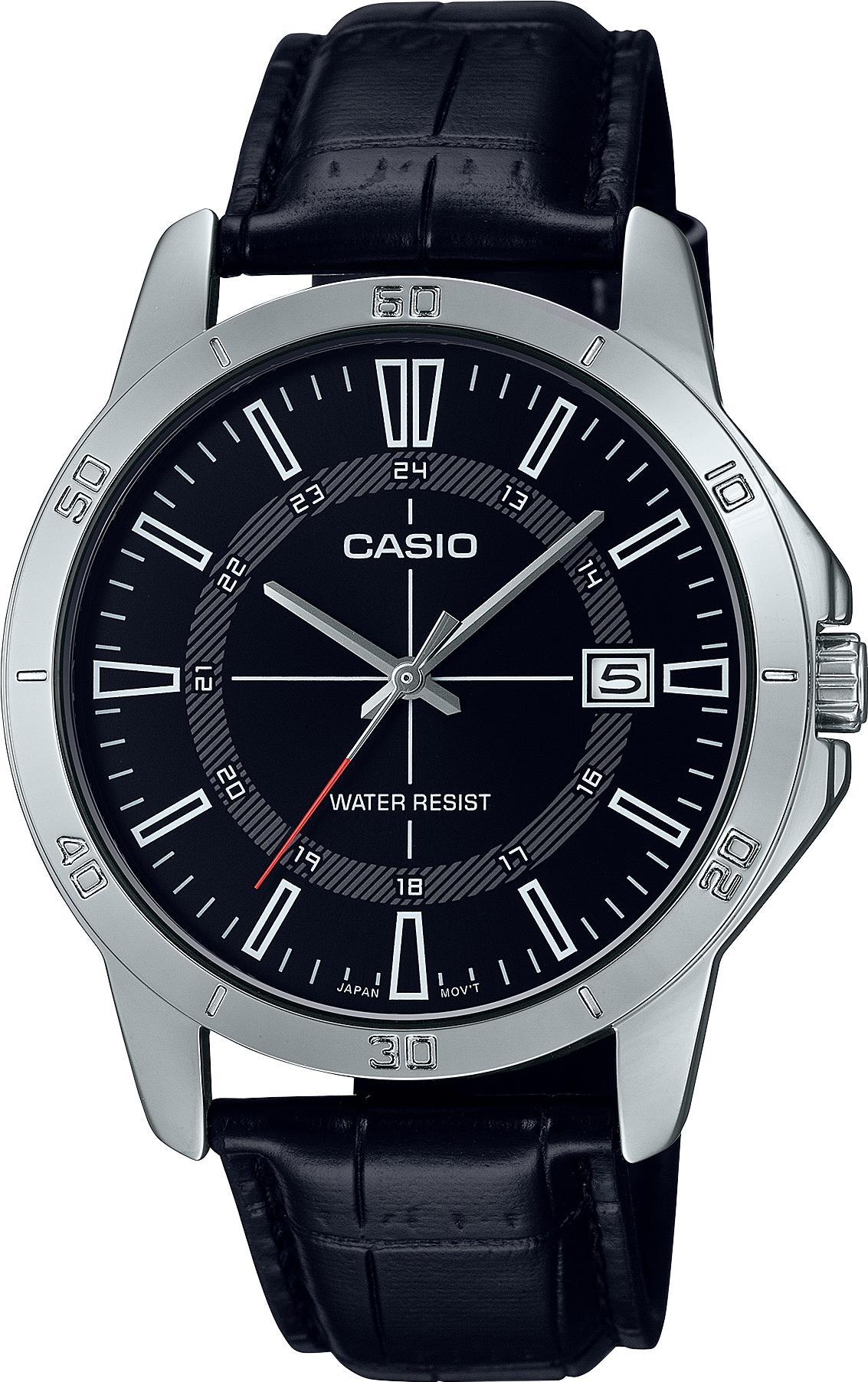 Мужские наручные часы Casio Collection MTP-V004L-1C. Точный кварцевый механизм с аналоговой индикацией. Ремешок изготовлен из кожи. Аккумулятор обеспечивает часы достаточным питанием приблизительно на 3 года. Браслет из нержавеющей стали. Прочное, устойчивое к царапинам минеральное стекло защищает часы от повреждений. На циферблате отображается текущее число месяца. Часы являются водонепроницаемыми до 3 Бар. Цвет циферблата: Серебристый. Цвет корпуса: Черный. Толщина: 8 мм. Гарантия: 2 года.