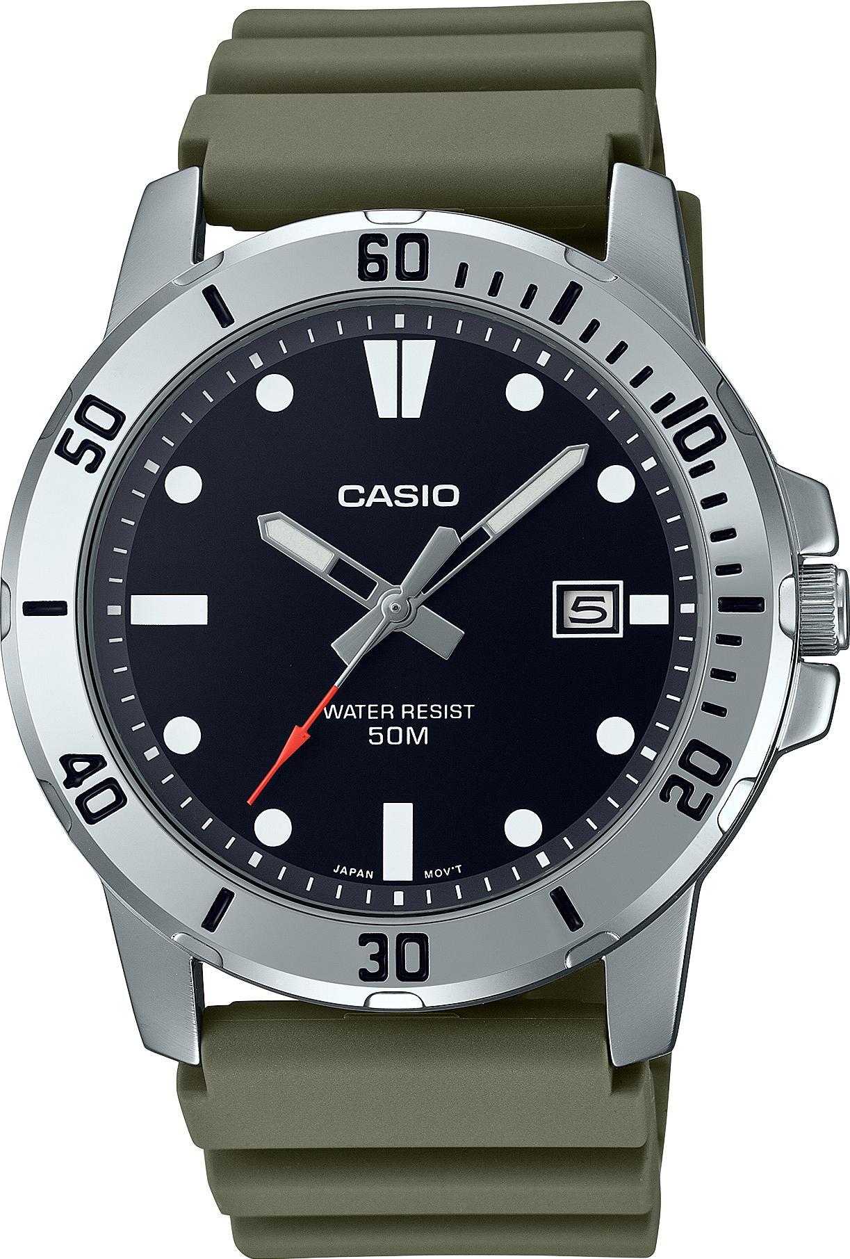 Мужские наручные часы Casio Collection MTP-VD01-3E. Точный кварцевый механизм с аналоговой индикацией. В отличие от механических часов, не требуют завода и работают от батареи, показывая отклонение всего несколько секунд в месяц. На стрелки нанесен светонакопительный состав. Полимерный ремешок. Натуральный полимерный материал является идеальным для изготовления ремешка благодаря своей чрезвычайной прочности и гибкости. Аккумулятор обеспечивает часы достаточным питанием приблизительно на 3 года. Корпус изготовлен из высококачественной часовой латуни с высокими антикоррозийными свойствами. Прочное, устойчивое к царапинам минеральное стекло защищает часы от повреждений. Часы являются водонепроницаемыми до 5 Бар. Цвет корпуса: Серебристый. Цвет циферблата: Черный. Высота (с ушками): 49 мм. Толщина: 10.3 мм. Гарантия: 2 года. Другие наименования модели: MTP-VD01-3EVUDF, MTP-VD01-3EV, MTP-VD01-3.