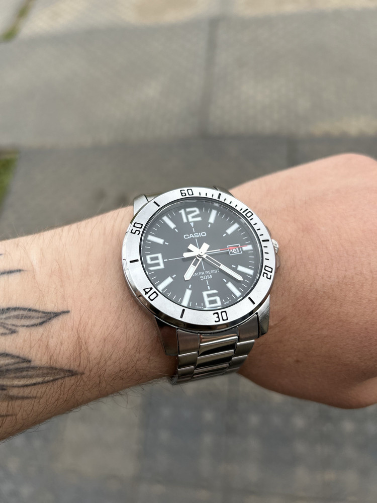 Мужские часы в универсальном стиле. Доступная цена. Круглый металлический корпус и браслет из нержавеющей стали. Безель с гравированной разметкой. Минеральное стекло. Водозащита 5 АТМ. Японский кварцевый механизм.