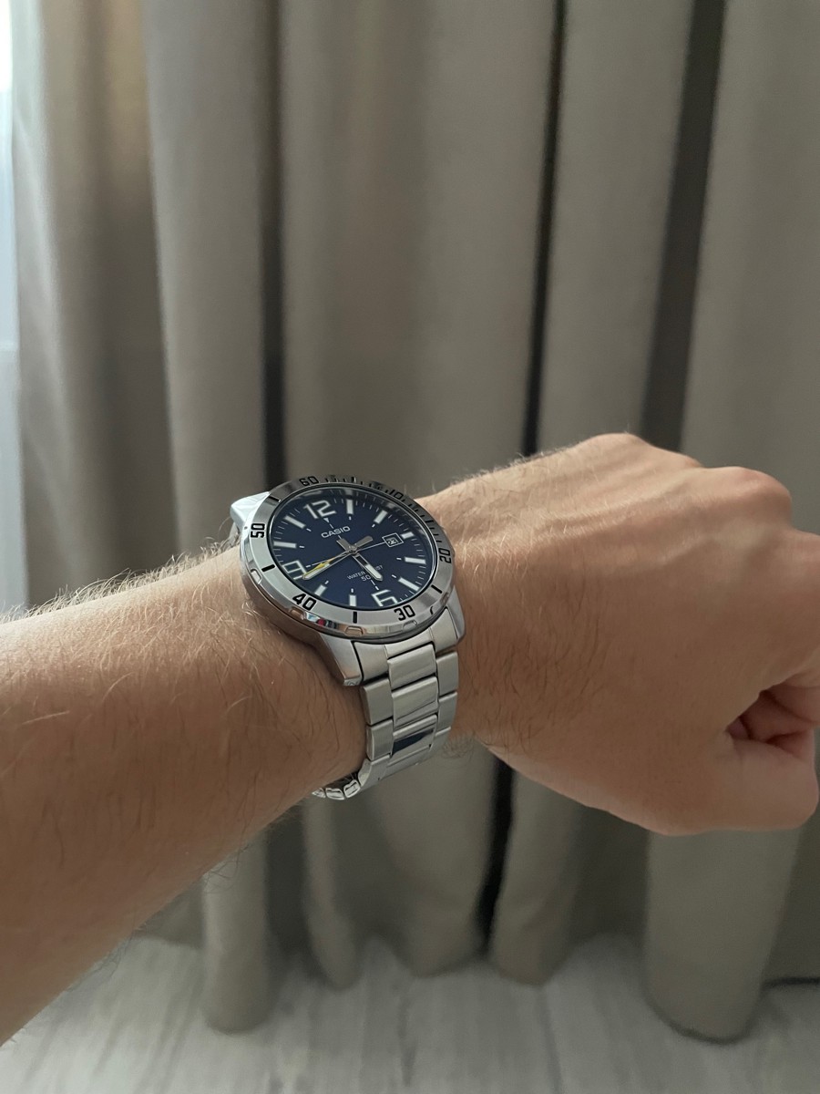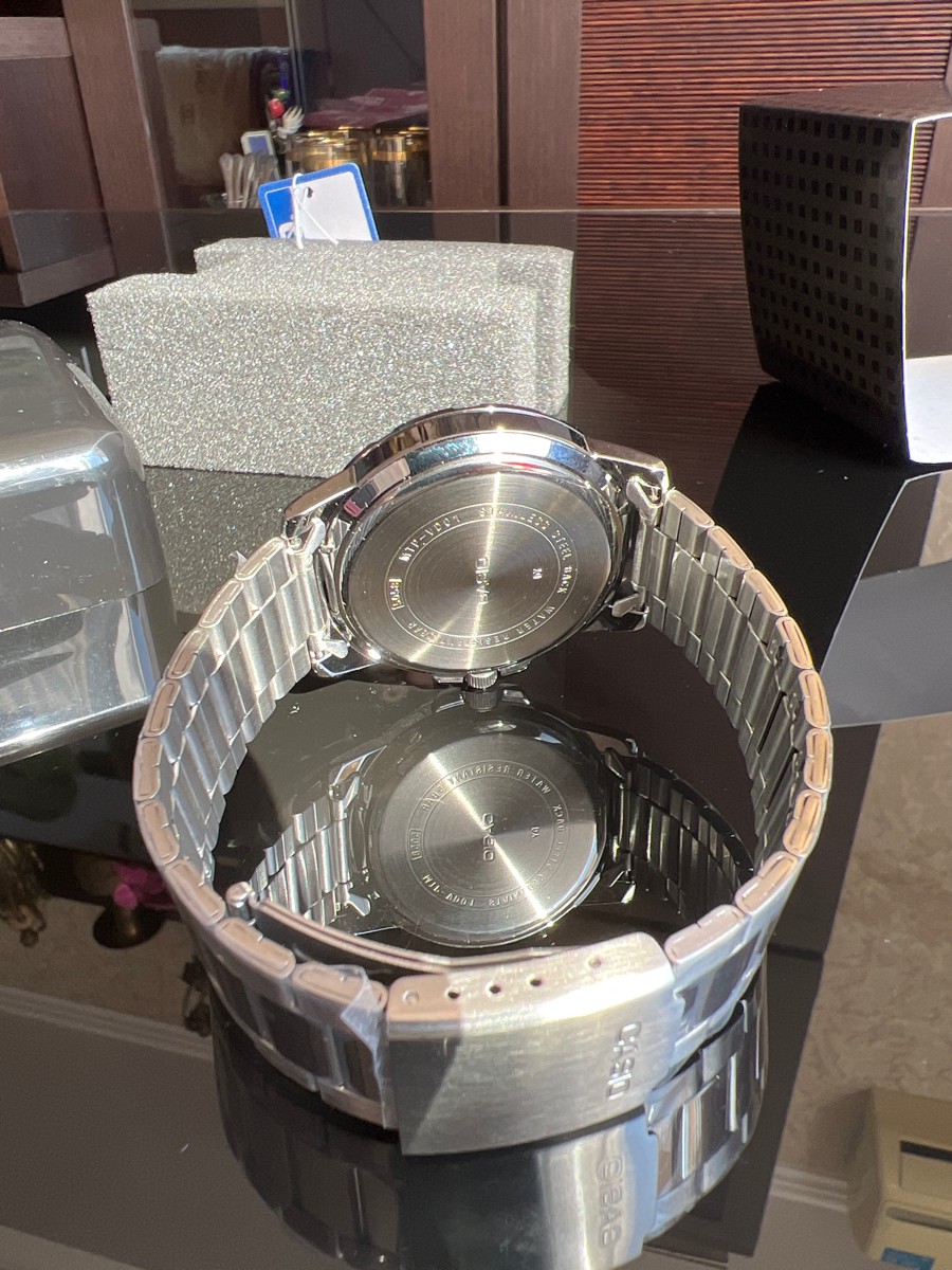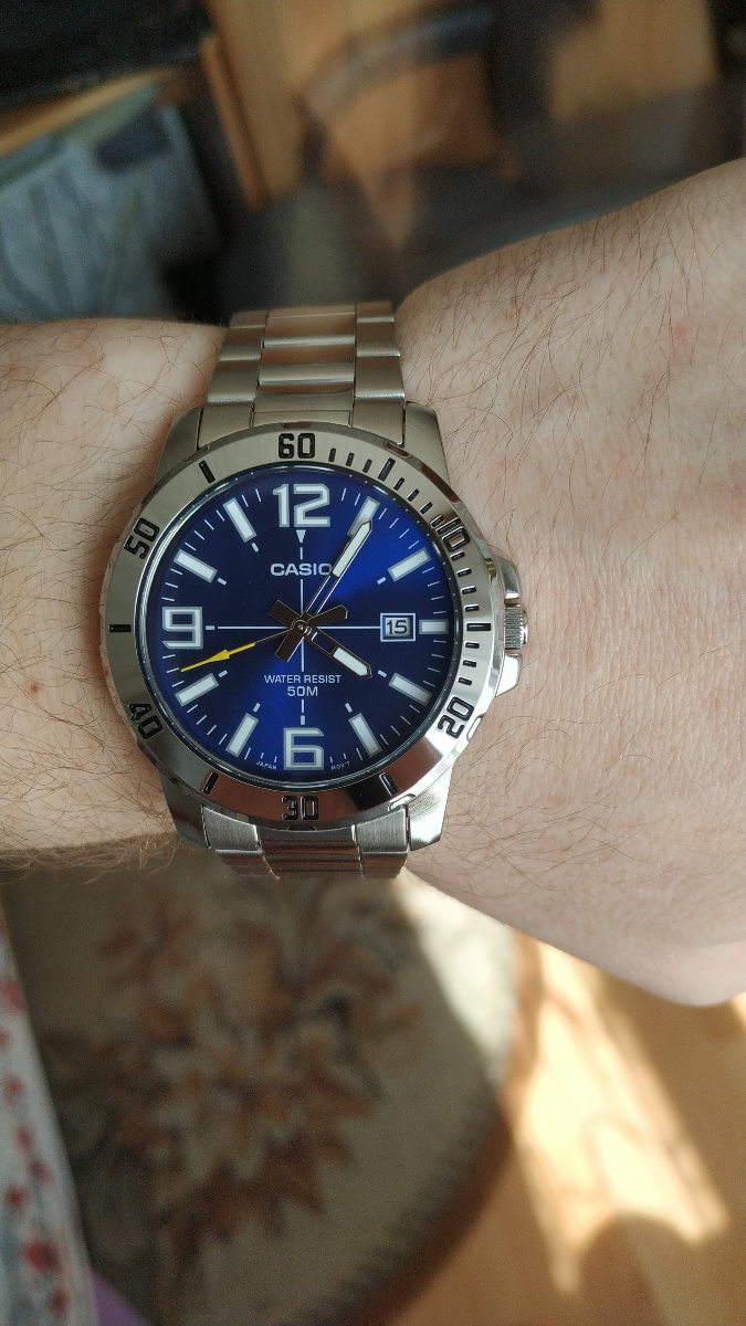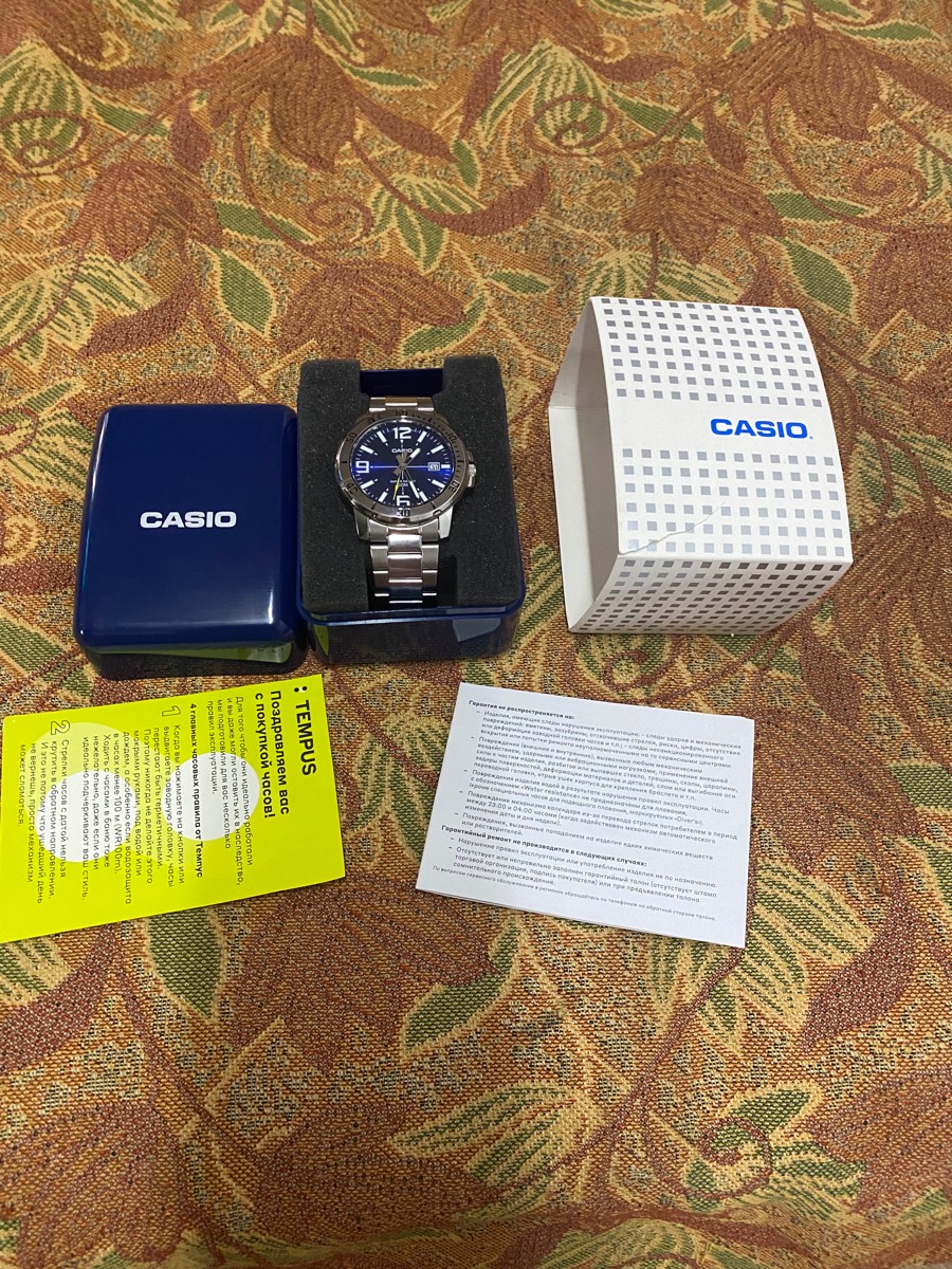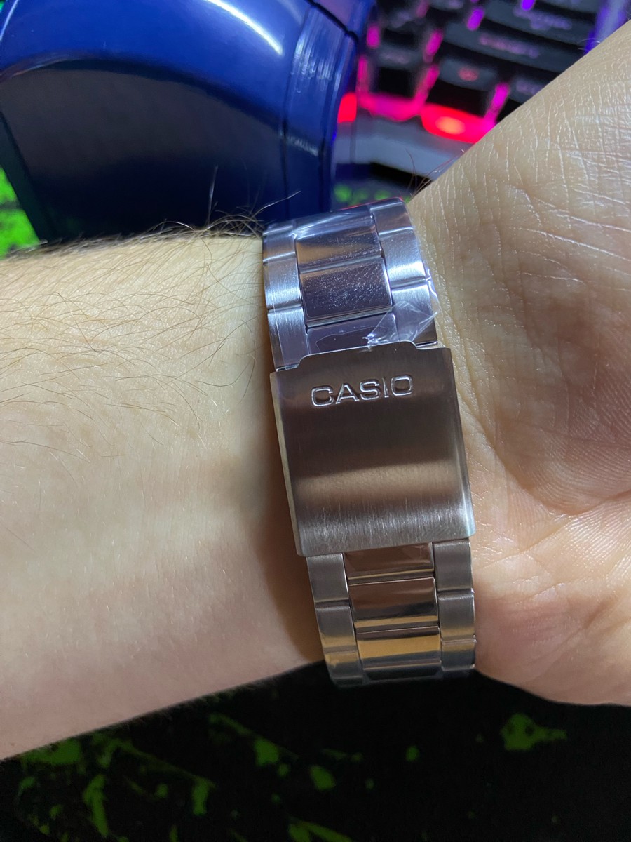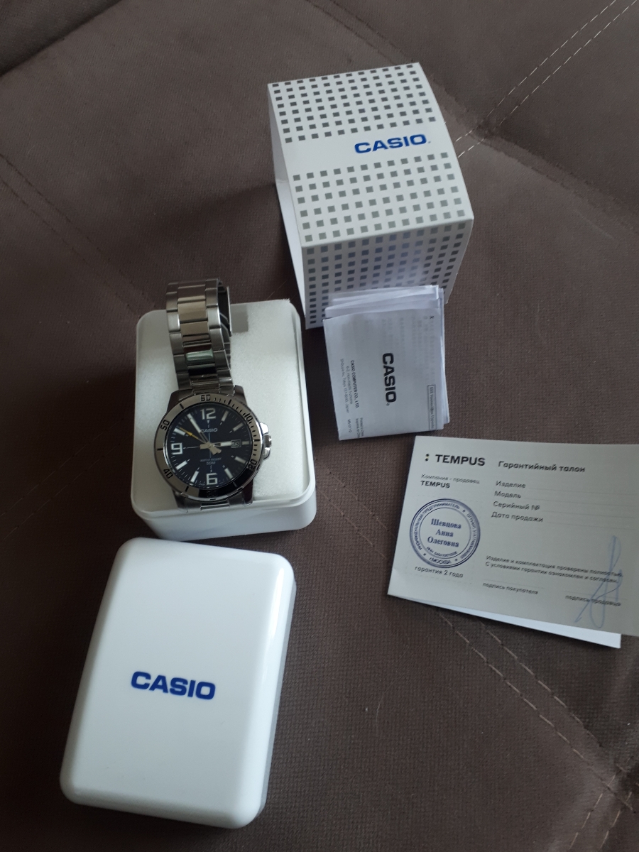 К часам марки Casio претензий никогда не было, покупаю не первый раз. Все самое необходимое в этих часах есть, корпус и браслет из нержавеющей стали, минеральное стекло, дата, водонепроницаемость 50м, батарейка служит долго и внешний вид нравится, уже подогнал по руке. Доставили в срок, упаковали в пупырку, цена отличная.