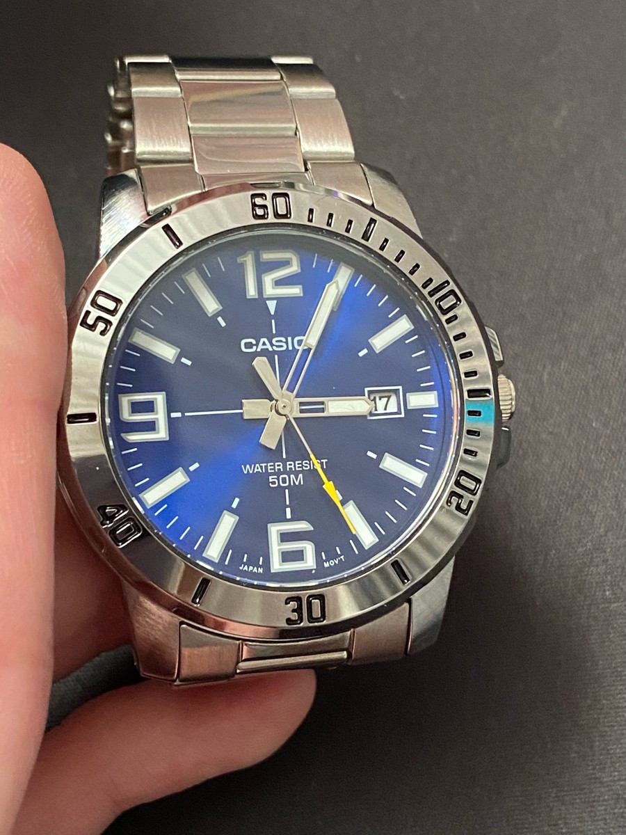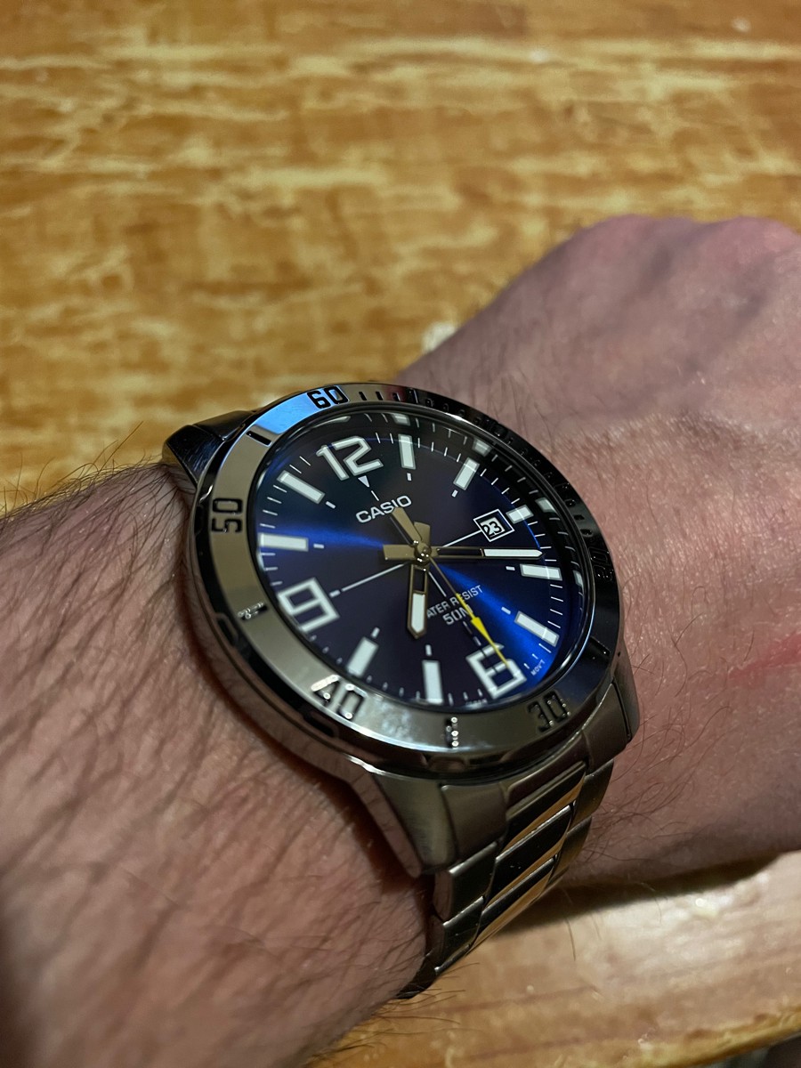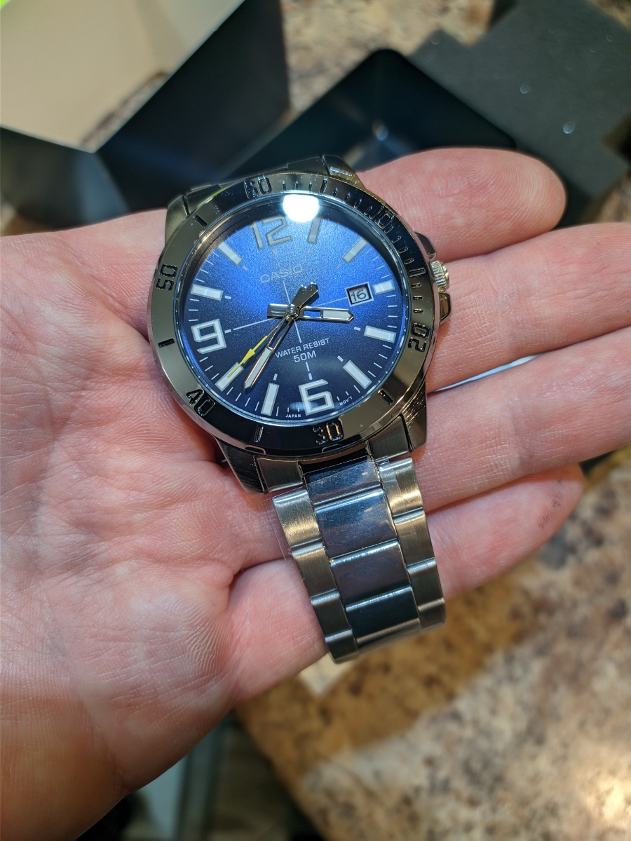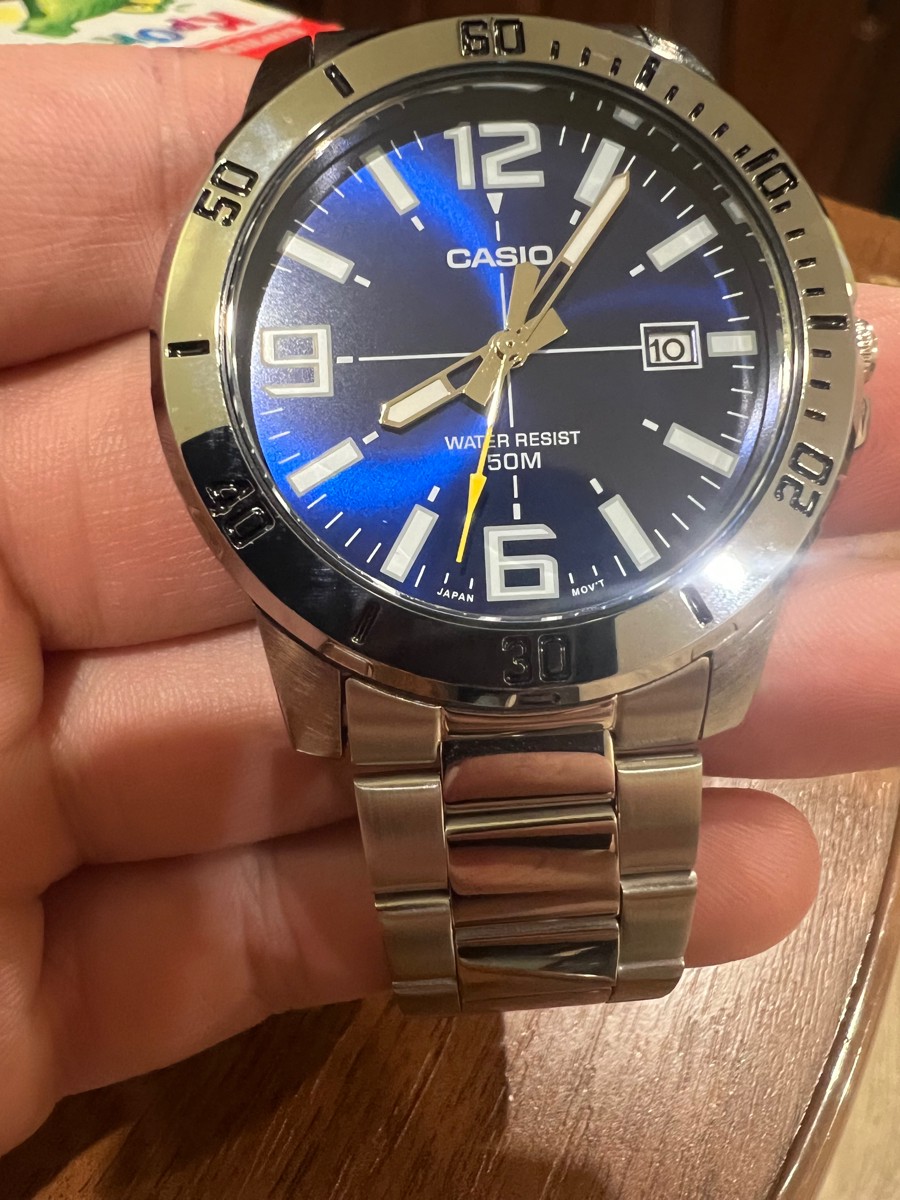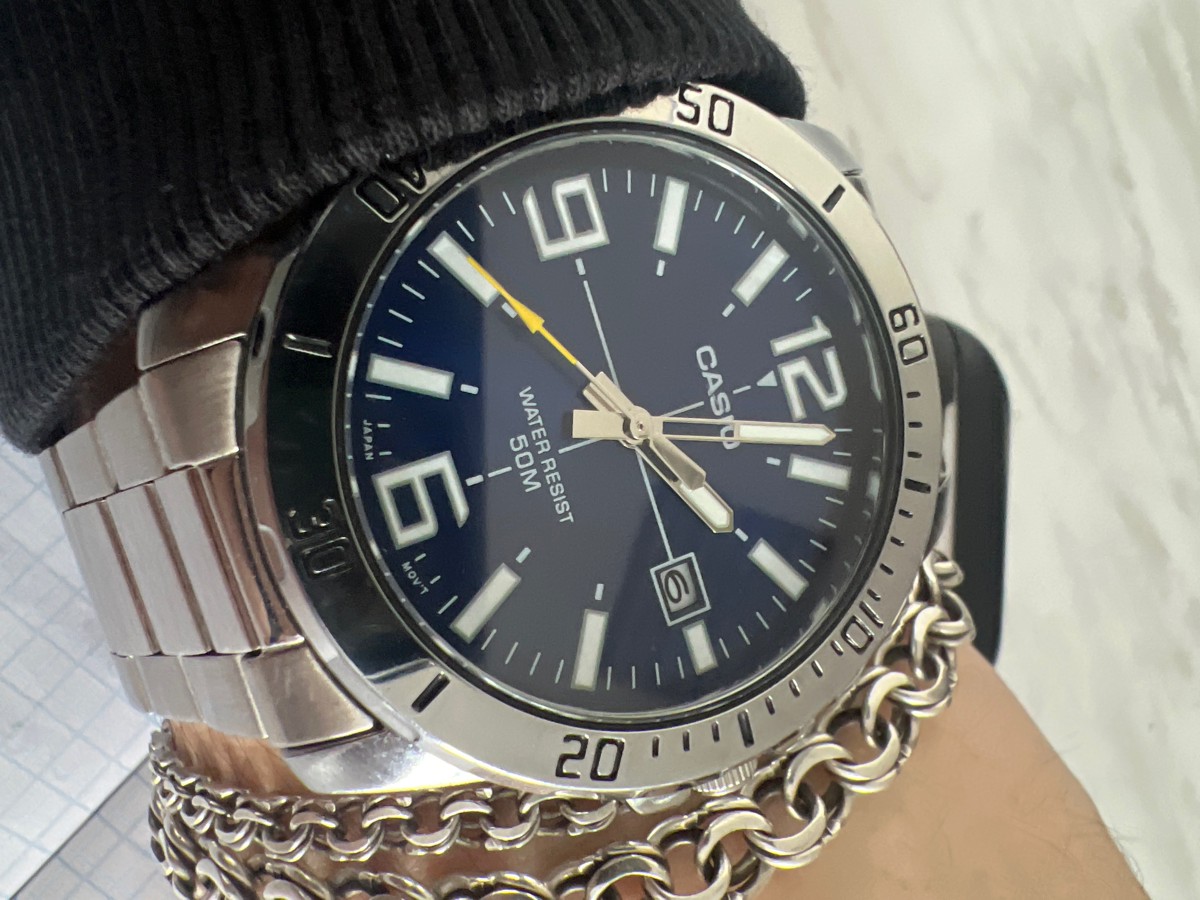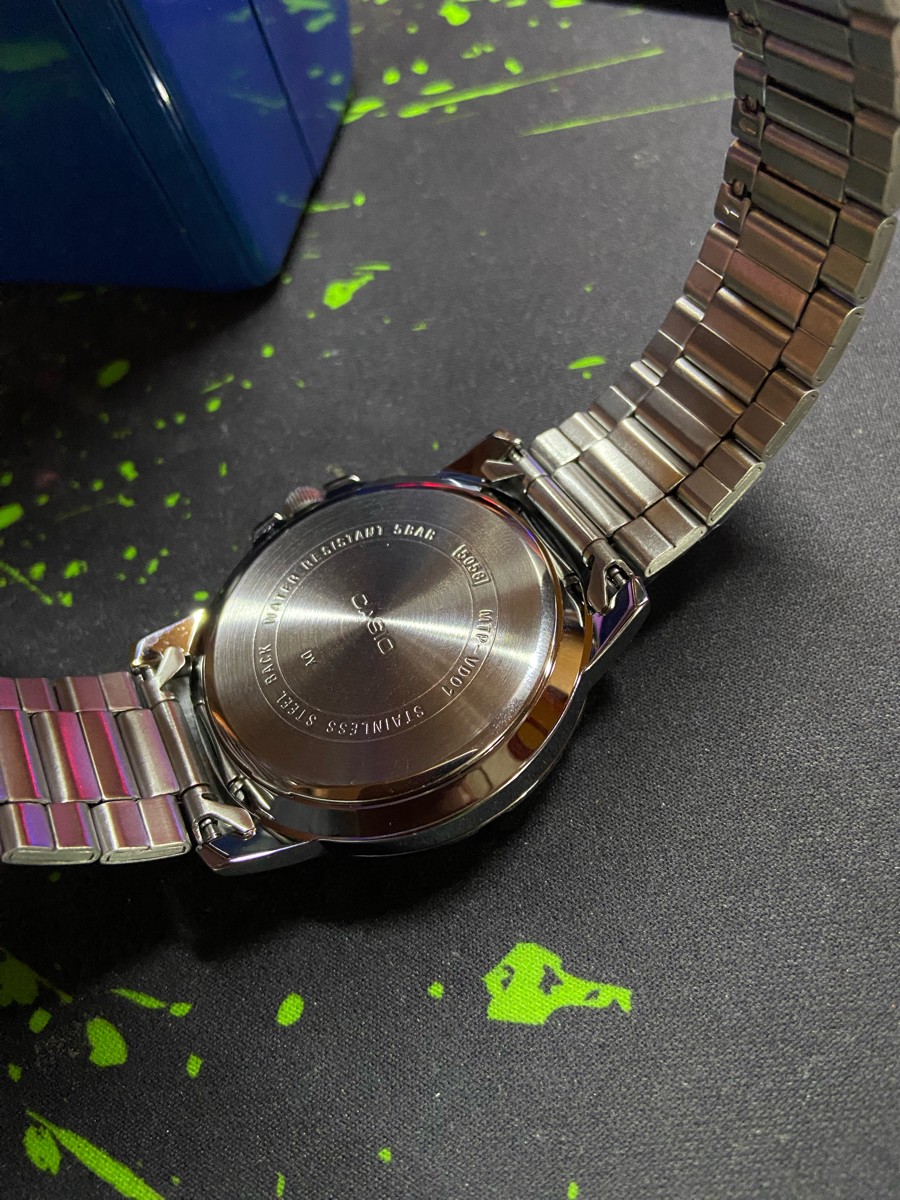 К часам марки Casio претензий никогда не было, покупаю не первый раз. Все самое необходимое в этих часах есть, корпус и браслет из нержавеющей стали, минеральное стекло, дата, водонепроницаемость 50м, батарейка служит долго и внешний вид нравится, уже подогнал по руке. Доставили в срок, упаковали в пупырку, цена отличная.