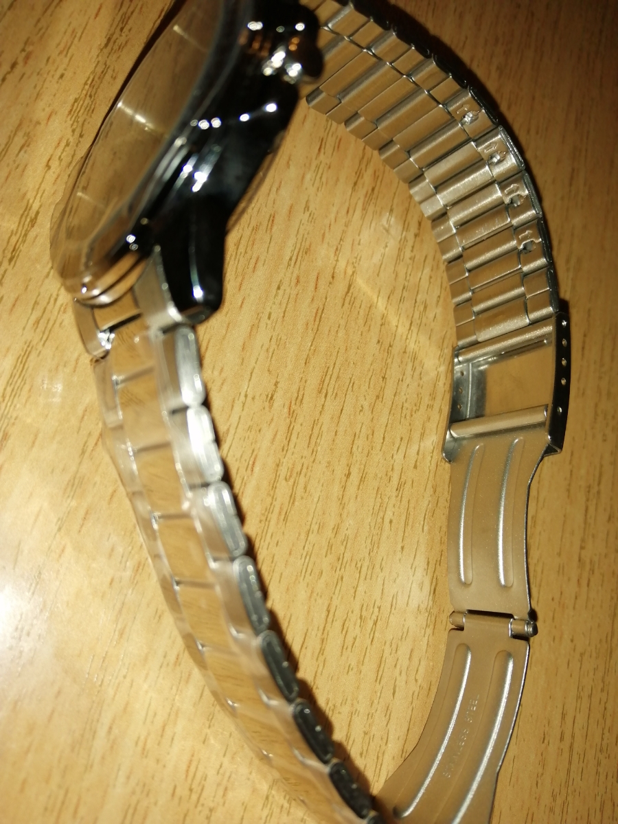 Прежде всего часы отлично упакованы. Красивая коробочка, гарантийный талон со штампом и открытой датой. Стекло и хром браслета покрыты защитной плёнкой. Большой запас по толщине запястья. У меня средняя, пришлось вынуть два звена. Звенья, при минимально правильном месте крепления рук, убираются очень просто. Про дизайн не буду, ибо "кому и кобыла невеста". Мне нравится. Наверное поэтому и выбрал))). Дата пролистывается на отдельном положении головки, стрелки крутить не нужно. По точности хода отпишусь позже.