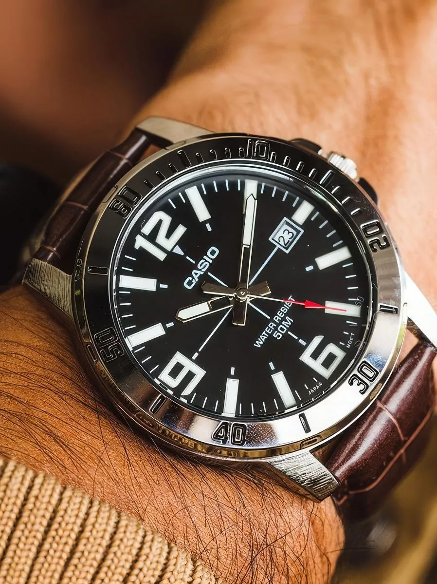Мужские часы в универсальном стиле. Доступная цена. Круглый металлический корпус, кожаный ремешок. Безель с гравированной разметкой. Минеральное стекло. Водозащита 5 АТМ. Японский кварцевый механизм.