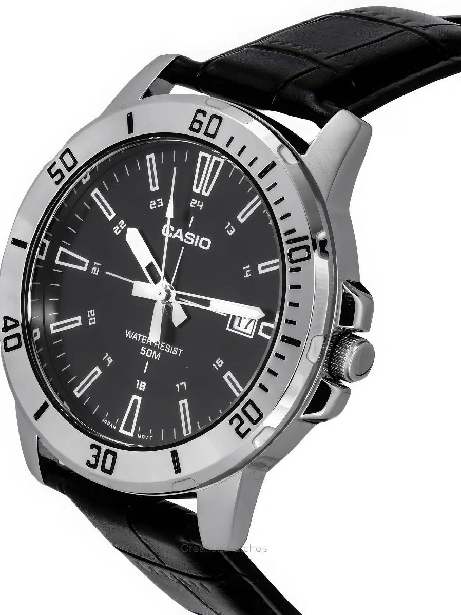 Мужские наручные часы Casio Collection MTP-VD01L-1C. Точный кварцевый механизм с аналоговой индикацией. Ремешок изготовлен из кожи. Аккумулятор обеспечивает часы достаточным питанием приблизительно на 3 года. Браслет из нержавеющей стали. Прочное, устойчивое к царапинам минеральное стекло защищает часы от повреждений. На циферблате отображается текущее число месяца. Часы являются водонепроницаемыми до 5 Бар. Цвет циферблата: Серебристый. Цвет корпуса: Черный. На стрелки и отметки нанесен светонакопительный состав, благодаря этому считывать информацию с циферблата возможно и в темноте. Толщина: 10 мм. Гарантия: 2 года.