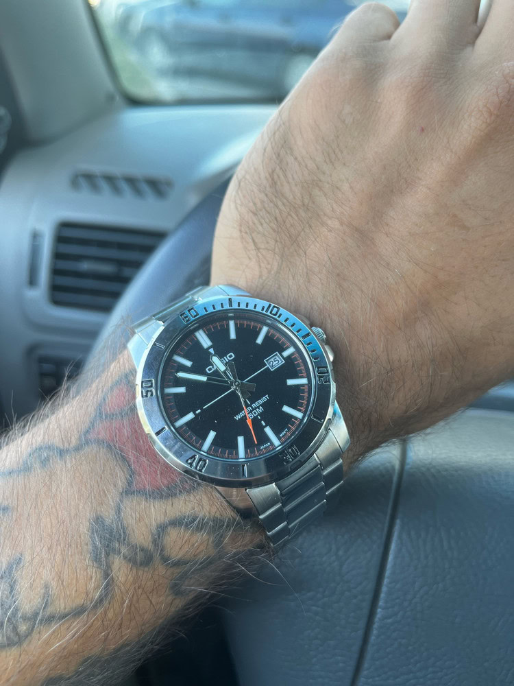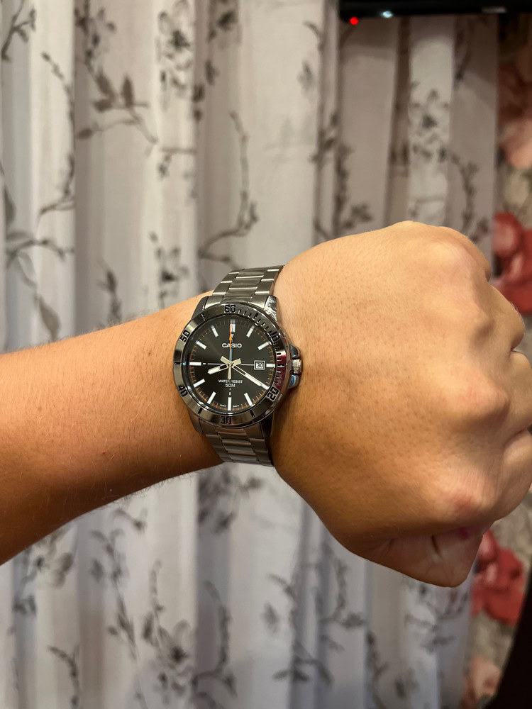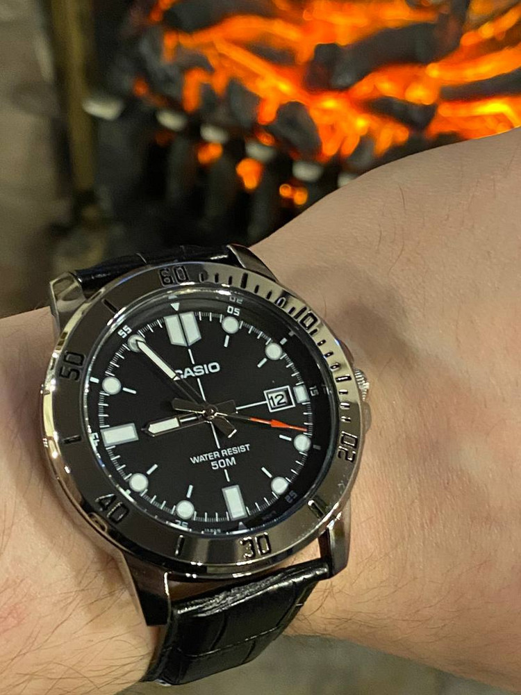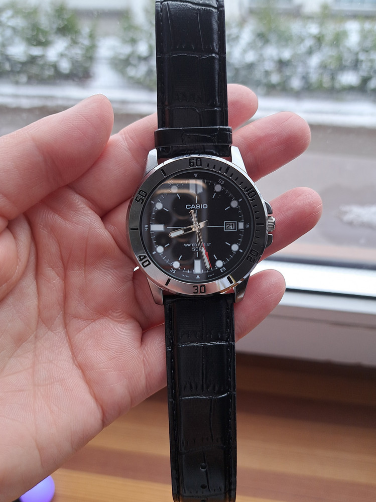 Не смотря на то, что доставка (не по вине Вайлдбериз) не много затянулась.. Нигатива нет. Часы классные, пришли в коробке, с документами, гарантией печатями как и пологается. Ремешок эко кожа. Не производит особенного впечатления надёжности, часы же напротив. У кого действительно толстая рука будьте осторожны, ремешок может не сомкнуться. У меня на пределе (предпоследнее отверстие). Ну в общем и целом впечатление хорошее на данный момент. Часы выглядят достойно, стильно. С брендом CASIO знаком давно. Лучшие среди доступных часов. По неубиваемости лидируют. Надеюсь здесь так же речь идёт о оригинальной продукции. Иное подтвердить не могу. Спасибо.