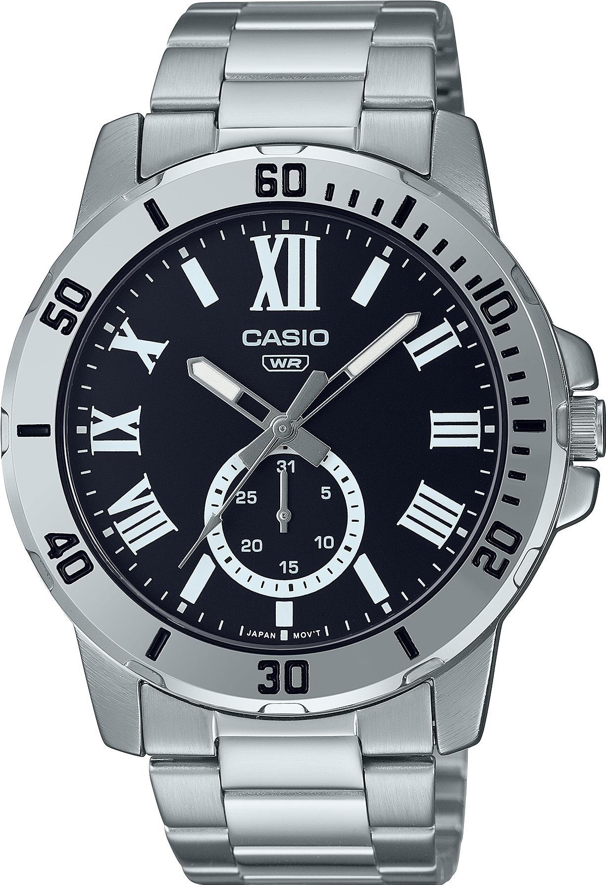 Мужские наручные часы Casio Collection MTP-VD200D-1B. Точный кварцевый механизм с аналоговой индикацией. Браслет из нержавеющей стали. Аккумулятор обеспечивает часы достаточным питанием приблизительно на 3 года. Браслет из нержавеющей стали. Прочное, устойчивое к царапинам минеральное стекло защищает часы от повреждений. Часы являются водонепроницаемыми до 3 Бар. Цвет циферблата: Серебристый. Цвет корпуса: Черный. На стрелки и отметки нанесен светонакопительный состав, благодаря этому считывать информацию с циферблата возможно и в темноте. Толщина: 9 мм. Гарантия: 2 года.