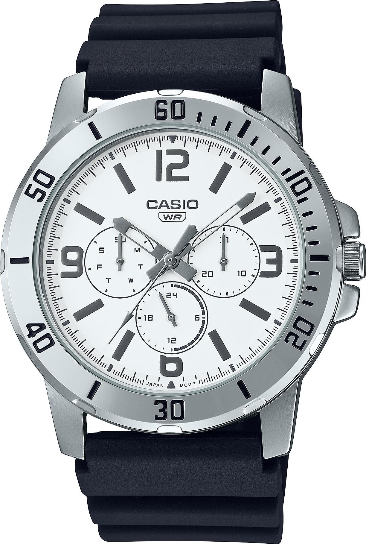 Мужские наручные часы Casio Collection MTP-VD300-7B. Точный кварцевый механизм с аналоговой индикацией. Полимерный ремешок. Натуральный полимерный материал является идеальным для изготовления ремешка благодаря своей чрезвычайной прочности и гибкости. Аккумулятор обеспечивает часы достаточным питанием приблизительно на 3 года. Браслет из нержавеющей стали. Прочное, устойчивое к царапинам минеральное стекло защищает часы от повреждений. На циферблате отображается текущее число месяца и день недели. Часы являются водонепроницаемыми до 3 Бар. Цвет циферблата: Серебристый. Цвет корпуса: Белый. Толщина: 8 мм. Гарантия: 2 года.