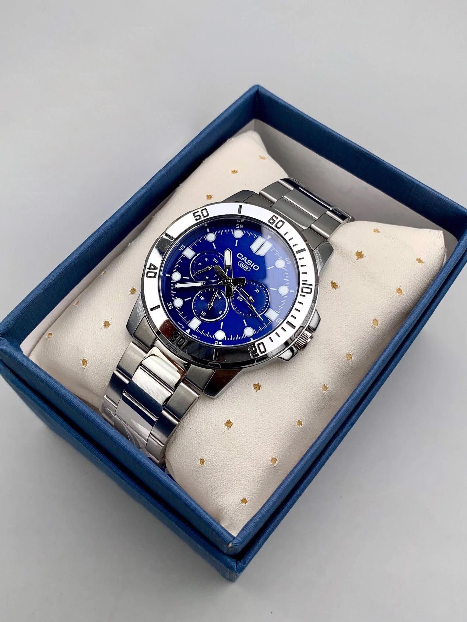 Мужские наручные часы Casio Collection MTP-VD300D-2E. Точный кварцевый механизм с аналоговой индикацией. Корпус изготовлен из высококачественной часовой латуни с высокими антикоррозийными свойствами. На стрелки и отметки нанесен светонакопительный состав, благодаря этому считывать информацию с циферблата возможно и в темноте. На циферблате отображается текущее число месяца и день недели. Аккумулятор обеспечивает часы достаточным питанием приблизительно на 3 года. Браслет из нержавеющей стали. Прочное, устойчивое к царапинам минеральное стекло защищает часы от повреждений.Часы являются водонепроницаемыми до 3 Бар. Цвет корпуса: Серебристый. Цвет циферблата: Синий. Ширина (с заводной головкой): 45мм. Толщина: 9мм. Гарантия: 2 года.