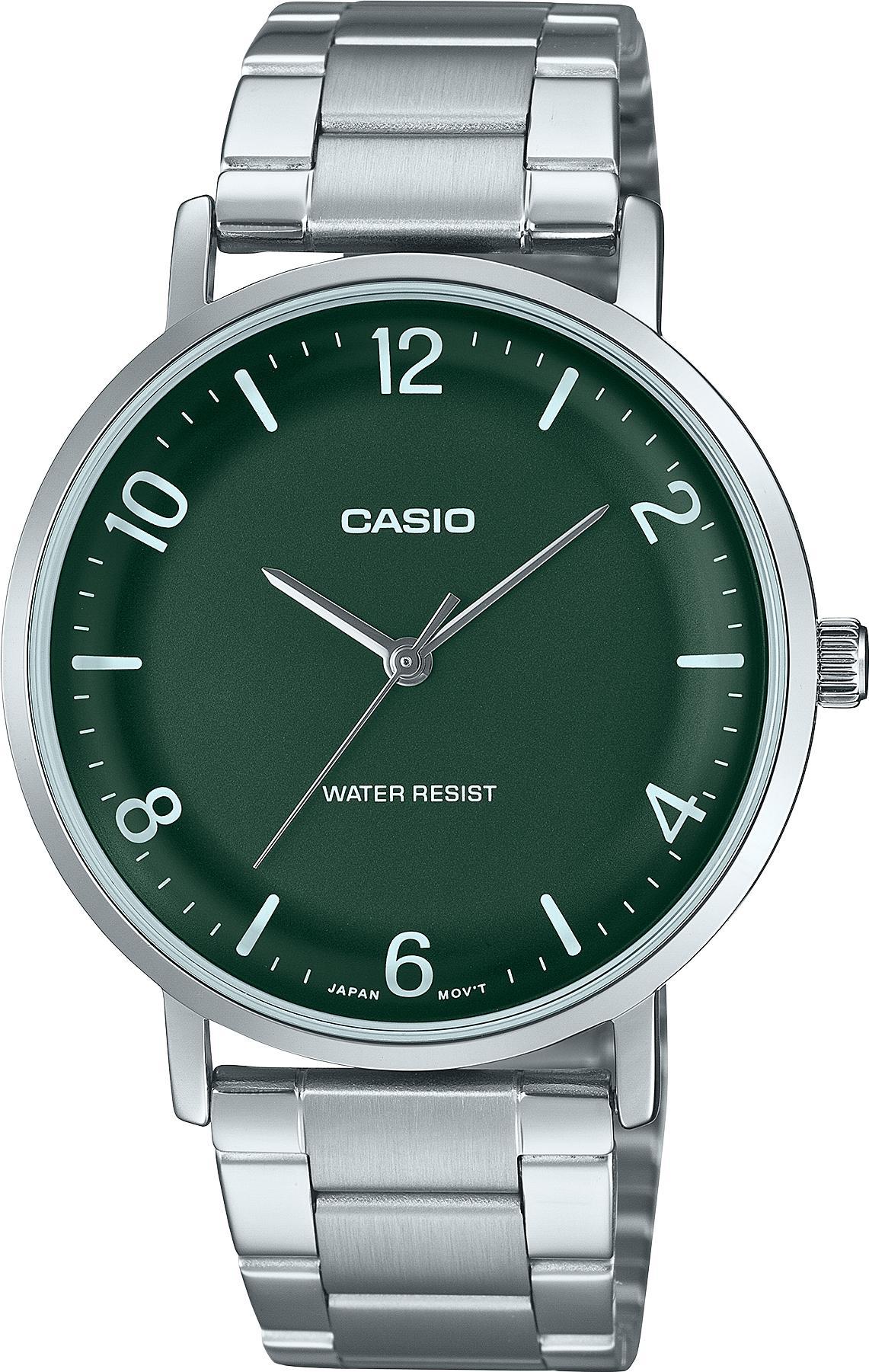 Мужские наручные часы Casio Collection MTP-VT03D-3B. Точный кварцевый механизм с аналоговой индикацией. Браслет из нержавеющей стали. Аккумулятор обеспечивает часы достаточным питанием приблизительно на 3 года. Браслет из нержавеющей стали. Прочное, устойчивое к царапинам минеральное стекло защищает часы от повреждений. Часы являются водонепроницаемыми до 3 Бар. Цвет циферблата: Серебристый. Цвет корпуса: Зеленый. Толщина: 8.2 мм. Гарантия: 2 года.
