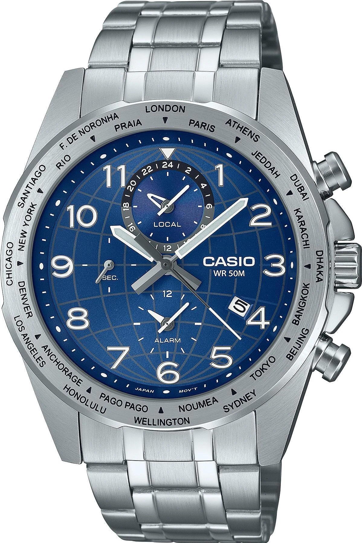 Мужские наручные часы Casio Collection MTP-W500D-2A. Точный кварцевый механизм с аналоговой индикацией. Браслет из нержавеющей стали. Отображение текущего времени в основных городах и конкретных областях по всему миру. Функция будильника. Аккумулятор обеспечивает часы достаточным питанием приблизительно на 3 года. Браслет из нержавеющей стали. Прочное, устойчивое к царапинам минеральное стекло защищает часы от повреждений. На циферблате отображается текущее число месяца. Часы являются водонепроницаемыми до 5 Бар. Цвет циферблата: Серебристый. Цвет корпуса: Синий. На стрелки и отметки нанесен светонакопительный состав, благодаря этому считывать информацию с циферблата возможно и в темноте. Толщина: 11 мм. Гарантия: 2 года.