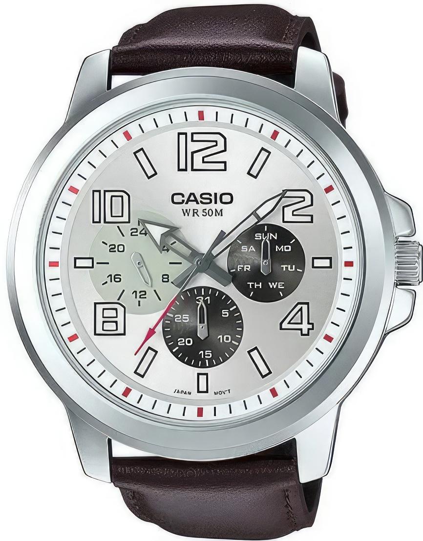 Мужские часы в универсальном стиле. Дизайн с элементами «милитари». Круглый металлический корпус с покрытием цвета стали, кожаный ремешок. Минеральное стекло. Японский кварцевый механизм с дополнительными индикаторами.
