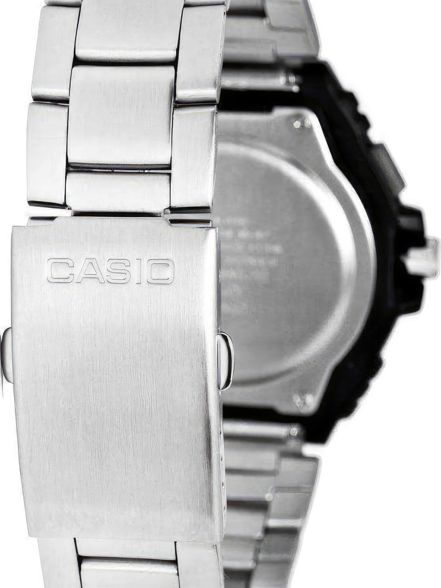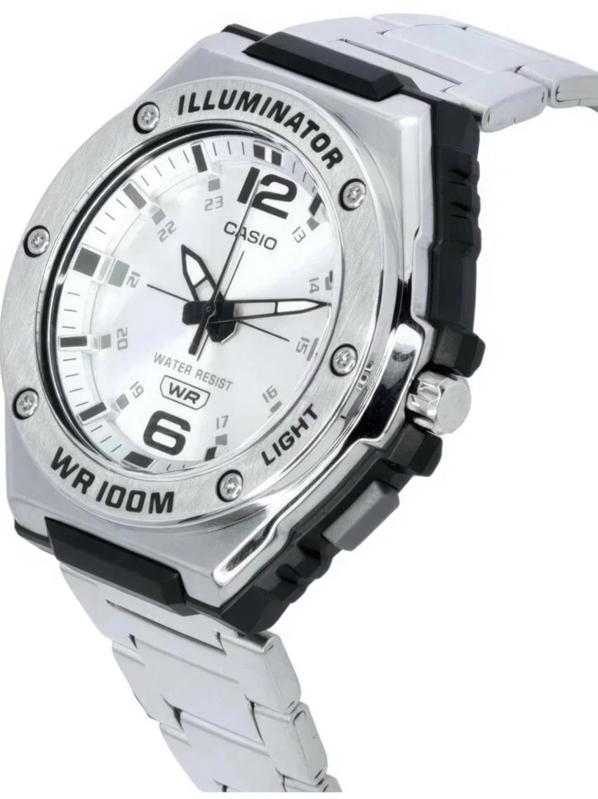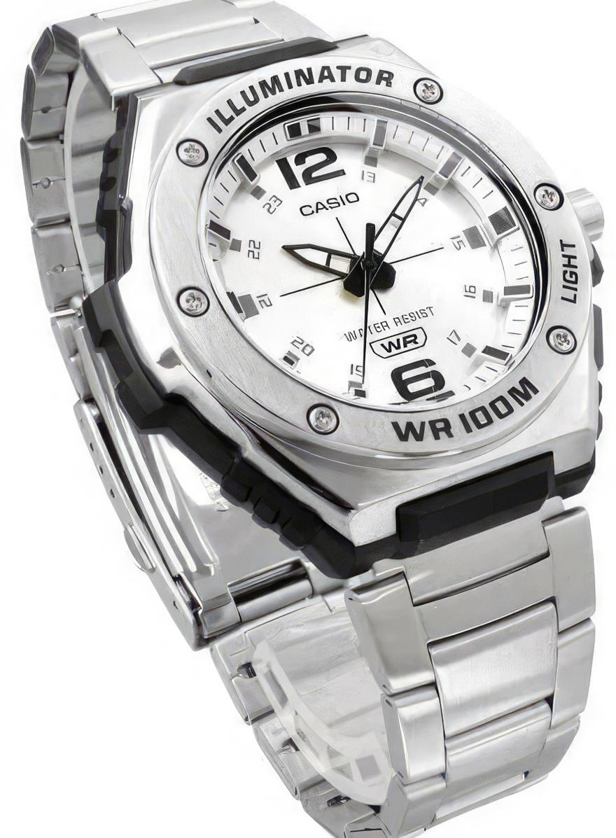 Мужские наручные часы Casio Collection MWA-100HD-7A. Точный кварцевый механизм с аналоговой индикацией. Корпус изготовлен из высококачественной нержавеющей стали 316L с высокими антикоррозийными свойствами. На стрелки и отметки нанесен светонакопительный состав, благодаря этому считывать информацию с циферблата возможно и в темноте. Ударопрочная конструкция часов защищает от ударов и вибрации. Аккумулятор обеспечивает часы достаточным питанием приблизительно на 3 года. Браслет из нержавеющей стали. Органическое стекло. Часы являются водонепроницаемыми до 10 Бар. Цвет корпуса: Серебристый. Цвет циферблата: Серебристый. Ширина (с заводной головкой): 50мм. Толщина: 13мм. Гарантия: 2 года. Другие наименования модели: MWA-100HD-7AVD, MWA-100HD-7AVEF.
