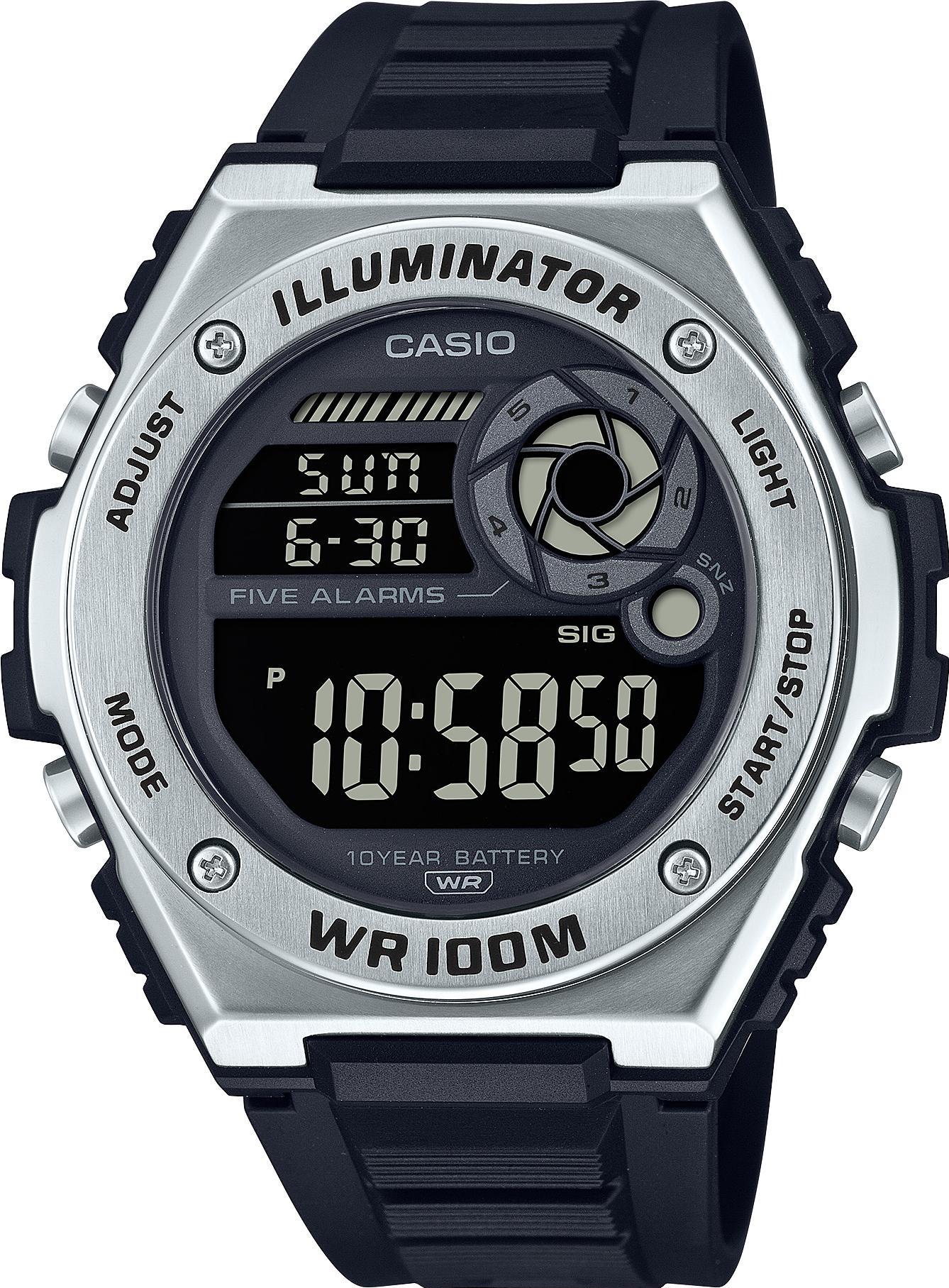 Мужские наручные часы Casio Collection MWD-100H-1B. Точный кварцевый механизм с цифровой индикацией. Корпус изготовлен из высококачественной нержавеющей стали 316L с высокими антикоррозийными свойствами. Светодиодная подсветка. На циферблате отображается текущее число, месяц и день недели. Ударопрочная конструкция часов защищает от ударов и вибрации. Функция хронографа. Функция будильника. Аккумулятор обеспечивает часы достаточным питанием приблизительно на 10 лет. После настройки автоматический календарь всегда отображает точную дату. Отображение времени возможно в 12-часовом или 24-часовом формате. Полимерный ремешок. Натуральный полимерный материал является идеальным для изготовления ремешка благодаря своей чрезвычайной прочности и гибкости. Прочное, устойчивое к царапинам минеральное стекло защищает часы от повреждений. Часы являются водонепроницаемыми до 10 Бар. Цвет корпуса: Черный. Цвет циферблата: Черный. Ширина (с заводной головкой): 52мм. Толщина: 14мм. Гарантия: 2 года. Другие наименования модели: MWD-100H-1BVD, MWD-100H-1BVDF.